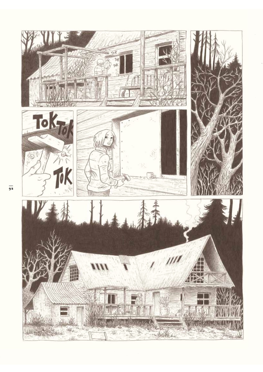 Avec Dans la forêt, Lomig transpose en bande dessinée le roman à succès de Jean Hegland, publié en 1996 aux États-Unis et traduit en France en 2017. Lomig offre une adaptation fidèle à l’original en reprenant la trame du roman ainsi que sa narration centrée autour d’un journal intime. Plutôt que de donner à voir l’effondrement de notre civilisation, Dans la forêt se focalise sur la capacité d’adaptation de deux jeunes femmes et l’évolution du regard qu’elles portent sur leur environnement. Ce choix narratif ancre le récit dans le genre du survivalisme. Le lecteur s’initie avec Eva et Nelly aux moyens de s’adapter dans un monde en ruines.