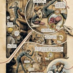 Benoît Dahan nous immerge complètement dans la tête de Holmes. Par un graphisme et une composition de pages tourbillonnantes. A travers un fil rouge auquel s’accroche tous les indices récoltés par l’homme de Baker Street, et que nous suivons visuellement tout au long des pages du récit, les méninges de Holmes se décomposent, se dilatent, se fractalisent presque pour nous faire miroiter l’intérieur de la tête de l’enquêteur. Jouant sur une sorte de grenier spirituel, où se trouvent des malles avec tous les éléments nécessaires aux échafaudages d’hypothèses de Sherlock.