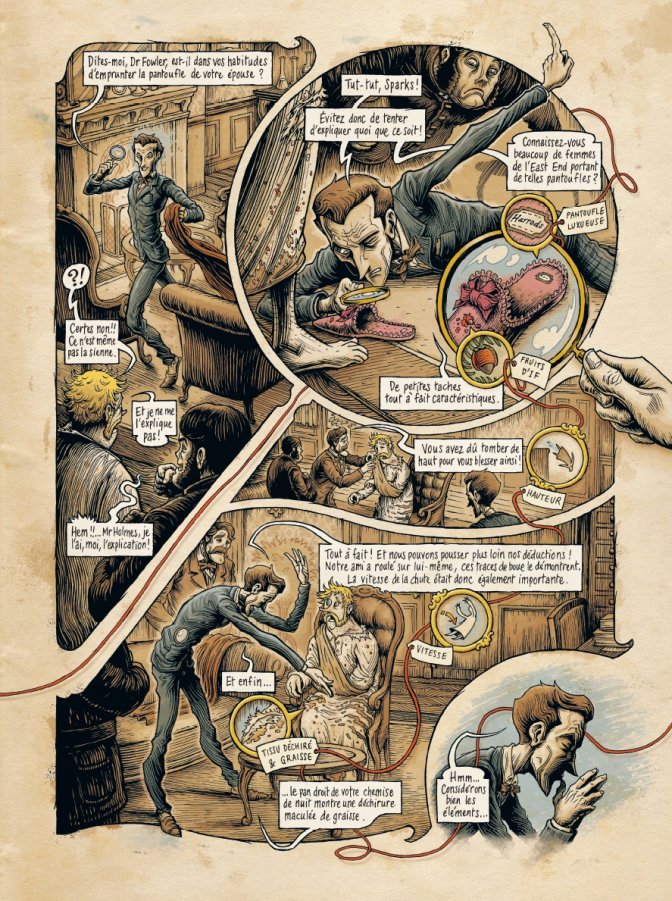 Pièces de maison où l’enquêteur se promène pour en sortir les éléments de ces théories, cases reliées par le fameux fil rouge et où l’on se perd, se demandant s’il faut suivre l’ordre naturel de lecture ou bien le fil qui se dévide de bande en bande. Mots qui s’entassent autour du visage concentré du héros. Tout est bon pour refléter la réflexion et les déductions, et tout fonctionne. Si l’on peut se tromper dans le sens de lecture, ça ne surprend pas, car nous sommes loin de turbiner aussi vite que le détective. Cette composition reflète comment tout s’imbrique dans le labyrinthe mental de Holmes, dans cette mansarde, comme il dit, qu’est son esprit. Et dans ces lieux, nous ne sommes que de pauvres Watson errant et essayant de retrouver le fil rouge et comment l’exploiter.
