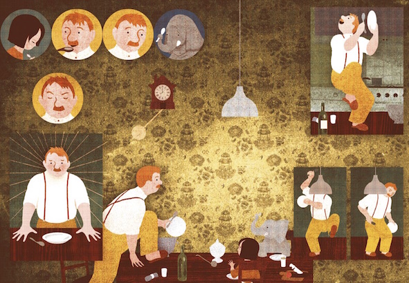 Comme dans ses imagiers, le sens repose en effet sur des analogies, antagonismes, au rythme de motifs fonctionnant comme des repères et d’actions perturbatrices. Ici, les papiers peints, pièces de la maison, objets, ou gestes installent une stabilité, qui n’a de but que d’être bouleversée.