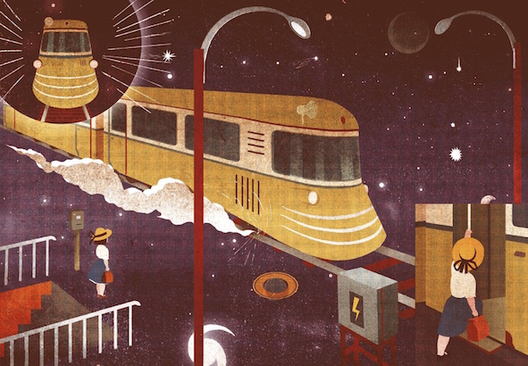 Du découpage, au tressage de la narration, en passant par la topographie du décor - le tout extrêmement maîtrisé – Blexbolex, construit l’architecture du récit, qui ne cherche finalement qu’à se libérer de ses contraintes créatrices : « Il y a un moment où il faut faire péter les règles, instaurer un autre mode que l’on peut injecter dans ce qui va suivre. Pour créer une caisse de résonance, donner une profondeur. » Toutes ses œuvres s’appuient en effet sur un processus de débordement. Hors-zone, de la manière la plus tranchée, disperse ses motifs, déstructure la narration, fait exploser la violence. Mais bien loin d’agresser son lecteur, le livre l’invite avant tout à s’émanciper. Comme cette petite fille de Nos Vacances qui, de ses difficultés relationnelles, se dérobe dans ses rêveries, s’évade vers les étoiles et grimpe dans le wagon d’un Train de nuit dans la voie lactée [7]. Si les réponses à ses conflictualités resteront probablement suspendues, elles auront néanmoins su créer les lieux de son existence.