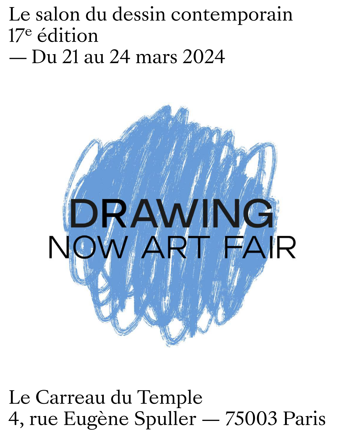 Le Drawing Now Art Fair, c’est la première foire d’art contemporain dédiée au dessin contemporain en Europe fondée par Christine Phal et dirigée par Carine Tissot. Elle comptera 73 galeries participantes pour sa 17e édition qui aura lieu du jeudi 21 au dimanche 24 mars 2024 au Carreau du Temple dans le 3e arrondissement à Paris.