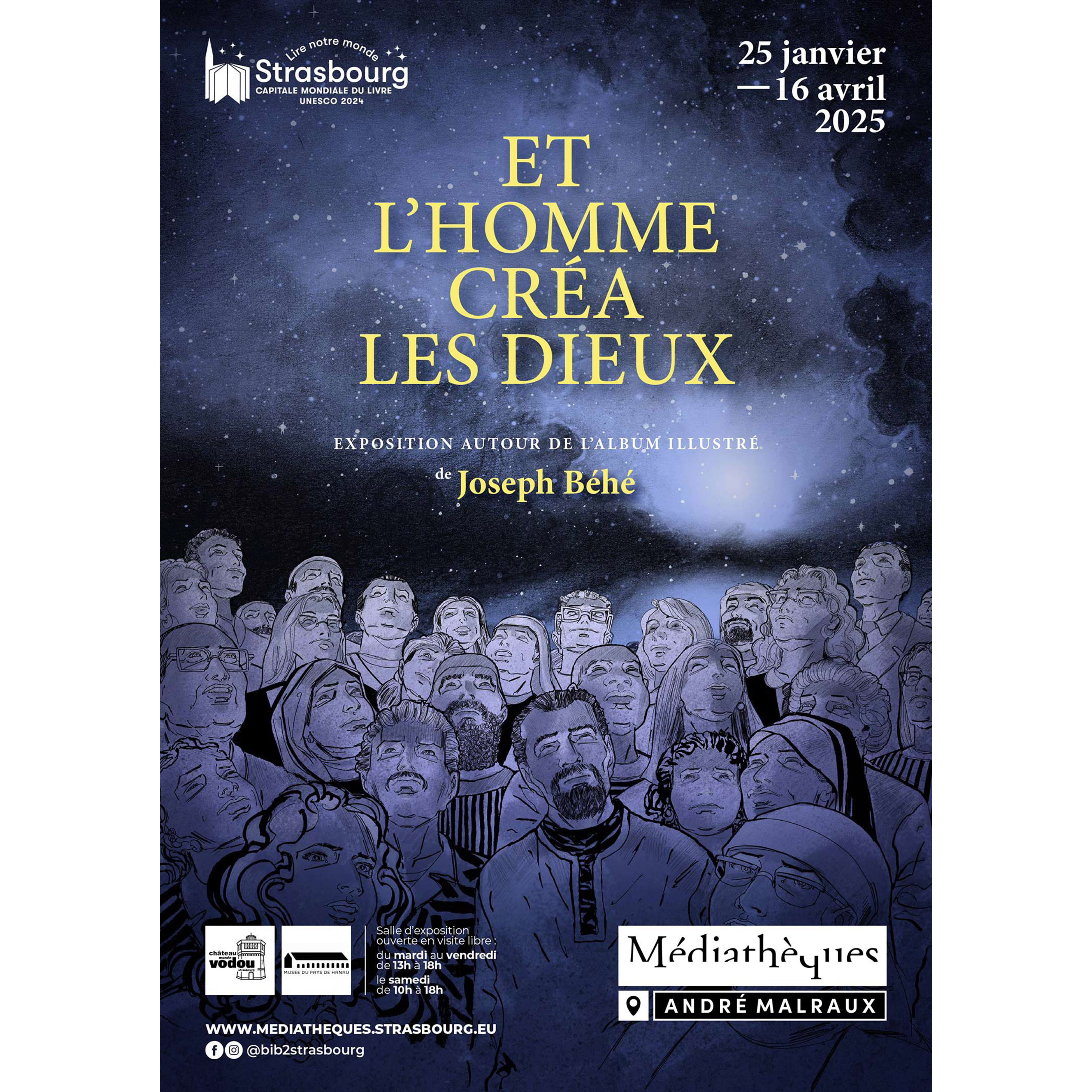 "Du 25 janvier au 16 avril 2025, cette exposition autour de la bande dessinée de Joseph Béhé (parue chez Futuropolis), met en dialogue les dessins originaux de l’illustrateur avec des objets remarquables prêtés par le musée Vodou, le musée du pays de Hanau ou issus des collections de la médiathèque".