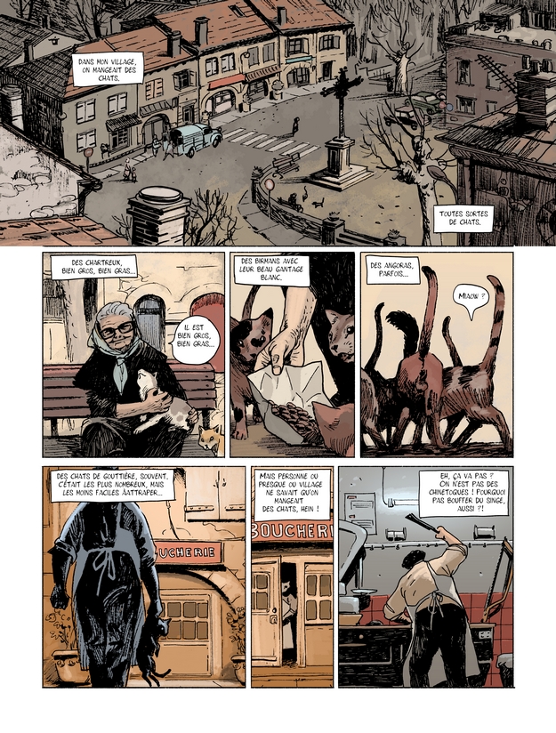 Résumé : Dans mon village, on mangeait des chats nous emporte dans une histoire noire. La vie de Jacques est bien sombre, entre un père routier alcoolique qui le frappe et une mère qui ne l’aime pas. Seul rayon de soleil, sa petite sœur. Mais les affaires de Jacques vont encore se compliquer quand il va découvrir le secret du boucher, qui est aussi le maire du village...