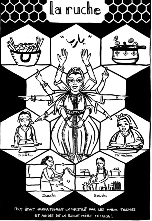 Zineb Benjelloun utilise pleinement les possibilités de la planche, et l’album se caractérise par la variété de son découpage. Le récit alterne ainsi entre des pages denses avec beaucoup de narratifs, et des planches où l’information passe par un dessin stylisé percutant qui emprunte à la caricature. La dessinatrice use aussi habilement de ses compétences de graphiste pour dresser, avec humour, le portrait des membres de sa famille (en particulier l’oncle Hbibi, un rêveur sans emploi à qui est dédicacé ce livre), de scènes parfois cocasses qui sont révélatrices des inégalités de genre, avec des femmes qui font tout que les hommes regardent la télévision… Les références à la culture marocaine de l’autrice sont également nombreuses dans le dessin, entre la très graphique calligraphie arabe, la décoration de la maison et les rituels familiaux.
