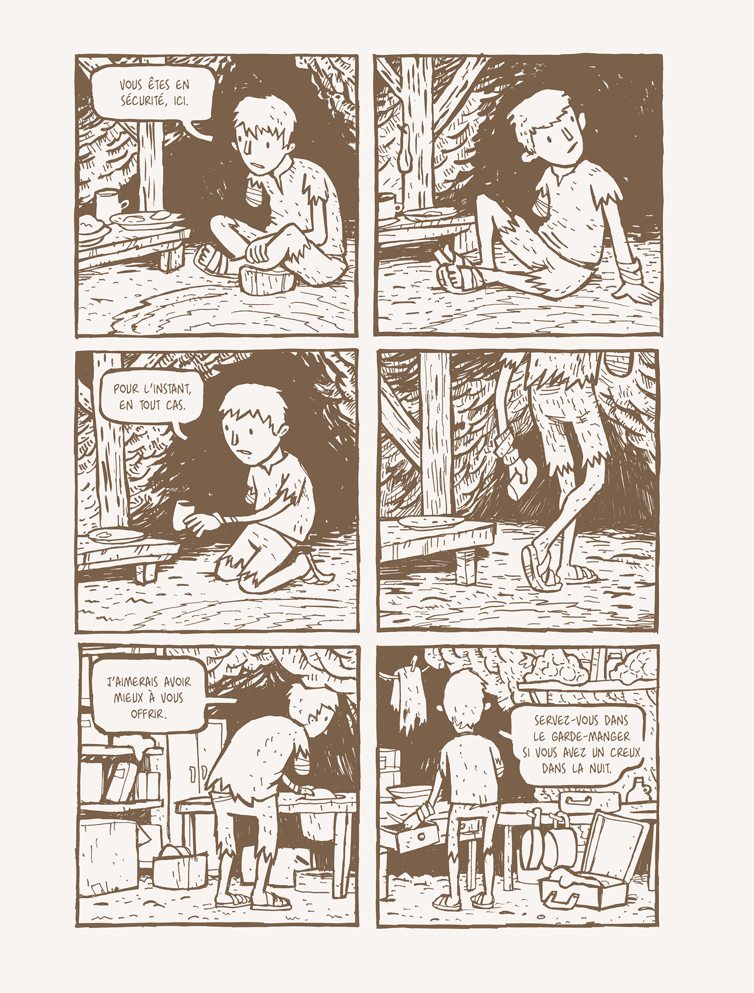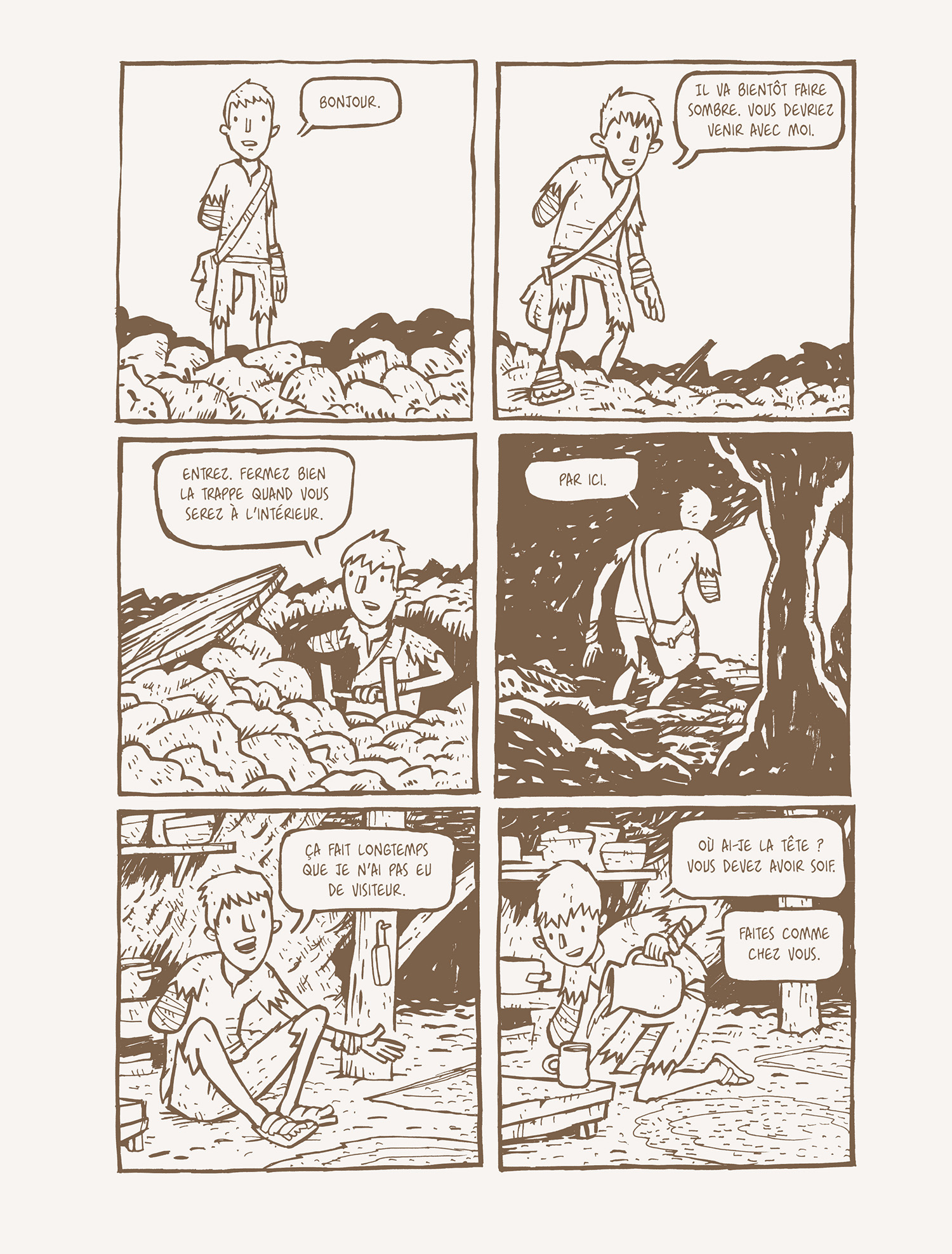 Le dessin fait lui aussi un pari, celui d’un monde où il n’y a rien d’autre à montrer que des décombres, des rochers et du bois qui ont l’allure de carton, tant le jaune et le marron sont à l’honneur. C’est un peu comme si ces pages avaient été griffonnées sur des restes de carton, faute de papier, comme si le dessin minimaliste des yeux, des traits, était une condition du travail de narrateur dans un milieu hostile et post-apocalyptique. Faute de moyens, on s’adapte, et pourtant, par moments, il se dégage une certaine lumière, une légère beauté de ces pages couleur café, de ces tons proches du désert, comme une fable venue d’une terre reculée.
