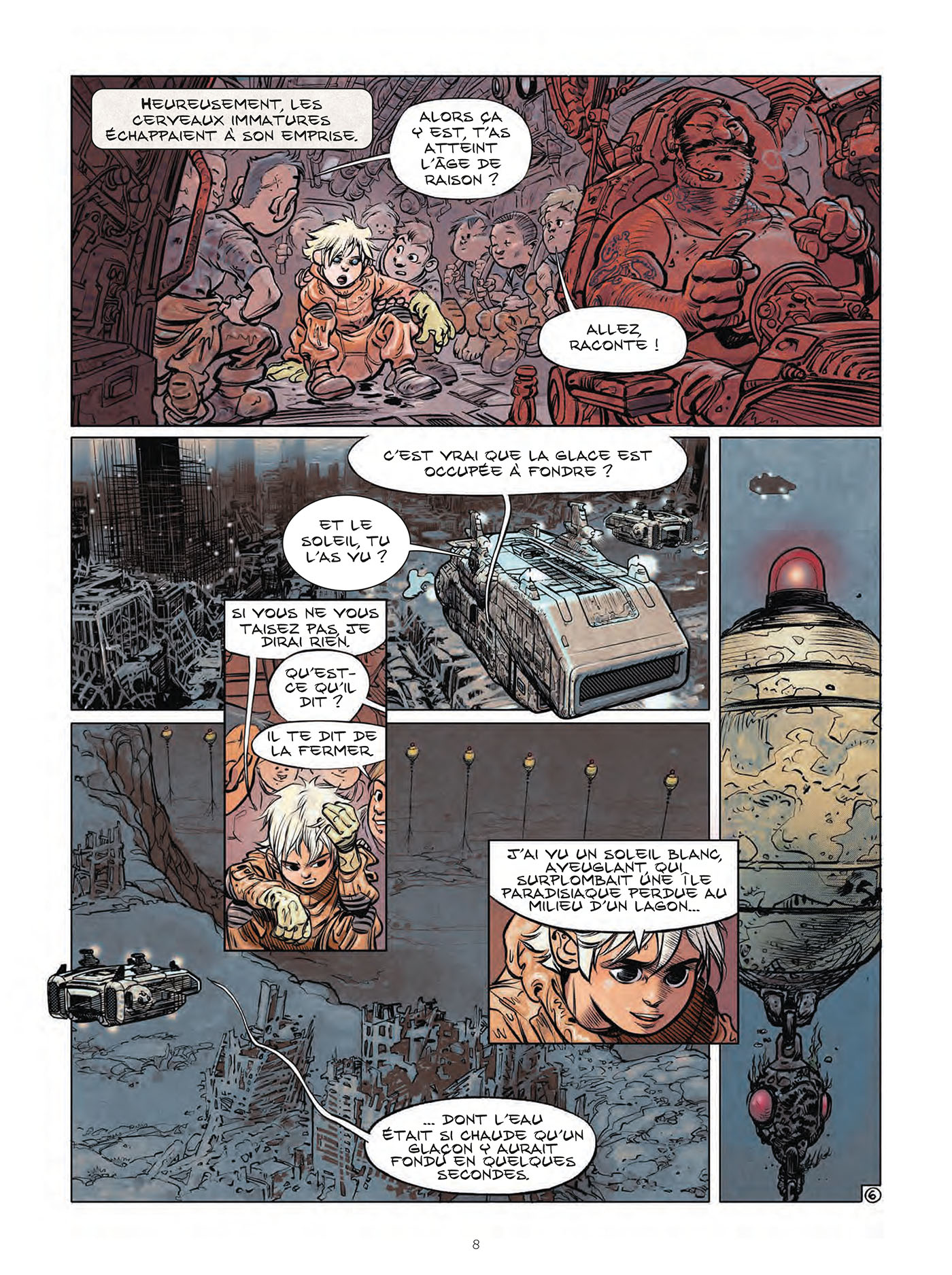 Résumé : La surface de la Terre est devenue invivable après une catastrophe, et la société humaine survit sous les eaux, où elle a reconstitué une ville morose aux règles rigides. Ce petit monde est refermé sur lui-même : seuls ceux qui partent chercher une ressource alimentaire bien spécifique (« la blanche ») dans un océan toxique. Tout juste sorti de l’orphelinat, Zac ne rêve que d’une chose : sortir de la cité pour découvrir l’extérieur. Convaincu qu’il existe d’autres sociétés, il désire entraîner son amie Silo et les deux jumeaux qu’ils ont récupéré…