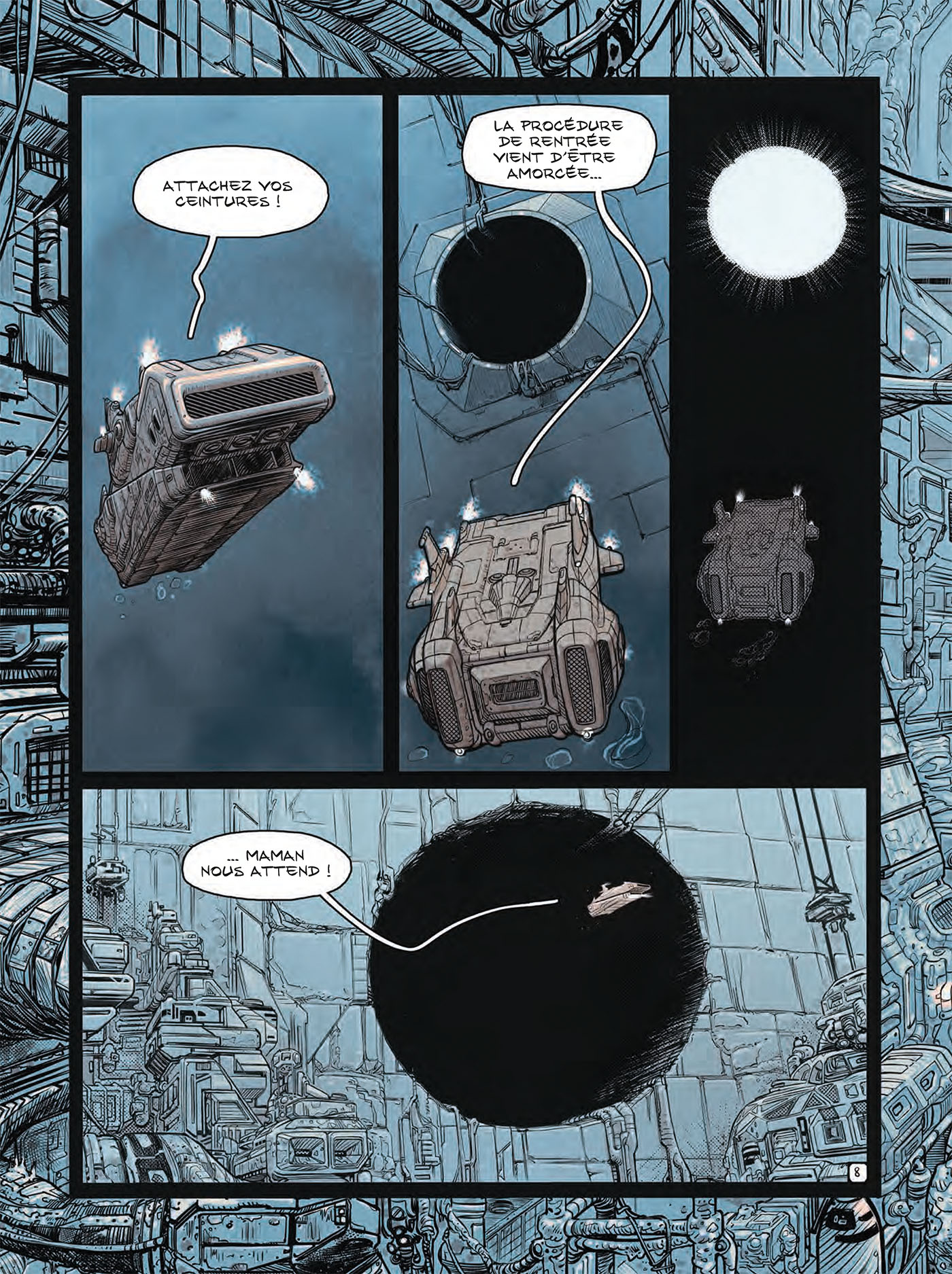 Critique : Porté par le graphisme rond aux décors très soignés de Dan, qui ravira les amateurs de bande dessinée franco-belge, Dehors mélange habilement l’angoisse d’un monde clos et froid – avec ses structures métalliques, la présence de systèmes de surveillance, la reconstitution d’une hiérarchie sociale rigide – à l’espoir et l’énergie incarnés par les enfants, qu’il est impossible de faire cesser de rêver. S’il rappelle des éléments déjà vus dans la littérature post-apocalyptique – à commencer par Silo – l’univers imaginé par Joël Hemberg s’avère très cohérent et suffisamment détaillé pour accrocher le lecteur. Derrière la volonté de faire perdurer l’humanité se cache une dictature qui masque la réalité à la population, qu’elle entretient dans un état de dépendance. Surtout, les reliquats de l’ancien monde sont cachés à la population, ce que Zac découvre lorsqu’il cherche le nom de la ville située au-dessus de « Maman », surnom de la cité où ils sont enfermés.