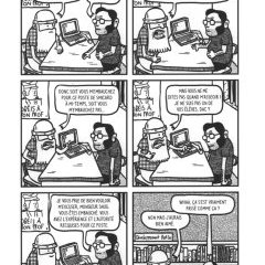 Disons-le tout net, cette bande dessinée, malgré son thème sérieux, dérape sans vergogne vers l’humour. Mais un humour léger, jouant sur l’absurde. L’auteur se mettant en abyme une fois, car il se représente lui-même, mais ce même auteur joue sur les possibilités du medium BD.
