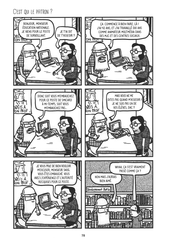 David Snug écrit et dessine cette BD qui revient sur sa propre vie. Jouant sur le fantastique et l’absurde, il nous offre une histoire drôle, impertinente et qui fait réfléchir sur la notion de travail. La postface de Julien Bordier développe les pistes de réflexion posées dans le récit.