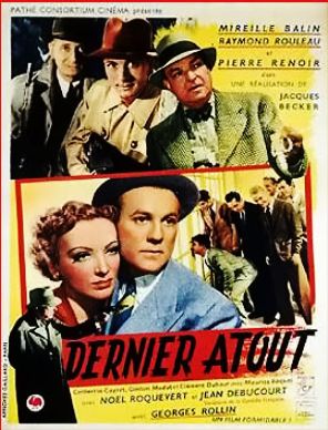 Ce mélange des genres et cette économie de moyens ne sont pas le moindre charme de ce récit élégant et elliptique qui annonce la suite de sa filmographie, notamment par le thème du conflit entre l’individuel et le collectif : Clarence (Raymond Rouleau), le policier solitaire qui finira par intégrer une équipe, est le précurseur du Goupi misanthrope et traditionaliste ou du Max le Menteur faussement désabusé (Jean Gabin) de Touchez pas au grisbi. Quant aux images de l’amitié ou de la rivalité masculine (sentimentale ou professionnelle), elles seront reprises dans Falbalas, Touchez pas au grisbi et Le trou. Mais ici, on marivaude à l’ombre des révolvers, et l’on se tue entre deux scènes de séduction : Dernier atout est donc plus proche de la légèreté d’Édouard et Caroline que de la noirceur tragique de Casque d’or. Il faut enfin souligner le plaisir de revoir les grands « excentriques » du cinéma de l’époque : Jean Debucourt en autoritaire chef de la police, Roger Blin en flic déguisé, Gaston Modot en ennemi public numéro un, et surtout Noël Roquevert en instructeur acariâtre et dépassé. Mais c’est la présence de Mireille Balin (1909-1968), la « Marlene Dietrich française », qui crève le plus l’écran par sa beauté et son magnétisme : elle avait incarné les femmes fatales depuis Pépé le Moko et offre ici sa dernière grande prestation, la même année que Macao, l’enfer du jeu.