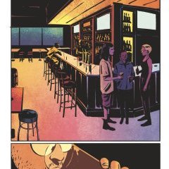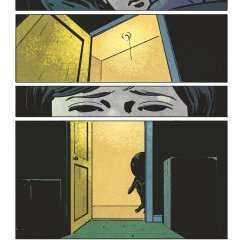 Critique : One-shot scénarisé par le maître de l’horreur James Tynion IV – auteur entre autres de The Nice House of the Lake et Something is Killing the Children –, Derrière la porte explore les peurs infantiles en convoquant le fameux « monstre derrière la porte ». Et si ce monstre existait vraiment, quelle forme prendrait-il ? C’est là toute la question posée par ce récit assez court – une petite centaine de pages, avec relativement peu de dialogues – au scénario efficace. Le dessin réaliste de Gavin Fullerton repose essentiellement sur un jeu d’ombres et de lumière (avec des variations de noir, de bleu et de jaune), l’intégralité du récit se déroulant pendant la nuit. L’irruption du monstre fait l’objet de scènes muettes assez glaçantes, où les cris de l’enfant sont inaudibles. Les volumes de noir qui enserrent les personnages participent à l’effet d’épouvante, d’autant qu’on se met rapidement à la place de ce petit garçon terrorisé.