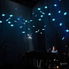 Or, justement, le concert et l’album de Nicolas Fraissinet prend ses racines dans un roman qu’il a écrit en 2019, Des étoiles dans les yeux, et que nous avions chroniqué sur AVoir-ALire. Le spectacle mêle avec habileté la musique, les chansons et des extraits de l’ouvrage, lus en toute simplicité sur le bord de l’instrument où l’interprète est assis. Il n’y a pas de rupture entre les passages qui sont récités et les chansons : au contraire, il y a une cohérence entre les deux, comme si, enfin, tous les arts pouvaient se rencontrer sur une scène de théâtre. Mais le chanteur n’en fait jamais trop. Il n’hésite pas à abandonner la poésie pour un rythme plus soutenu, les sonorités électroniques prennent le pas sur le piano ou la basse, puis, soudain, les étoiles se lèvent et la poésie refait surface.