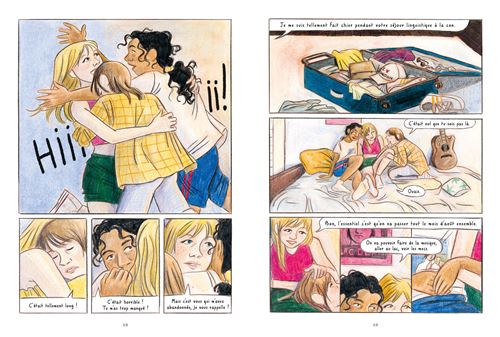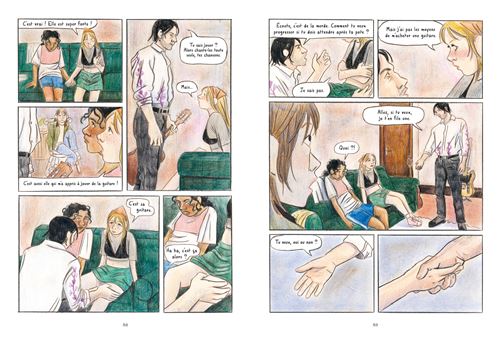 Graphiquement, cette bande dessinée parvient à nous faire sentir la fragilité de l’âge adolescent. Les dessins réalisés avec des crayons de couleur pastel donnent à la narration une enveloppe d’innocence et de candeur fragile qui contraste encore une fois avec les déchirures nombreuses qui marquent les cœurs des différents personnages. Le récit se déroule dans une mise en page soignée, ou l’enchaînement des cases donne une impression de glissement, d’inéluctabilité, pourtant, dans cette histoire, il aurait fallu de peu de choses pour que cela puisse être si différent. Les couleurs sont douces, les cases sont pleines, pas de vide au-dedans, mais des contours bien délimités, mais parfois, ils s’évanouissent pour donner place à des dessins saisissants. Il n’y a pas beaucoup de textes ou de dialogues, mais les images sont éloquentes. Il est question de sexe, mais il n’est jamais montré explicitement. L’autrice choisit de mettre les lecteurs.rices en position d’observateurs des scènes. Manon Debaye parvient ainsi à interroger notre propre regard sur ce déroule, nous incite à nous faire notre jugement, à questionner nos représentations par exemple sur l’image romantique de la rockstar, sur les passions adolescents ou bien encore sur les groupies qui ne sont bien souvent pas que de fans consommateurs et attentiste mais aussi capable de tirer de leur passion une force créatrice.