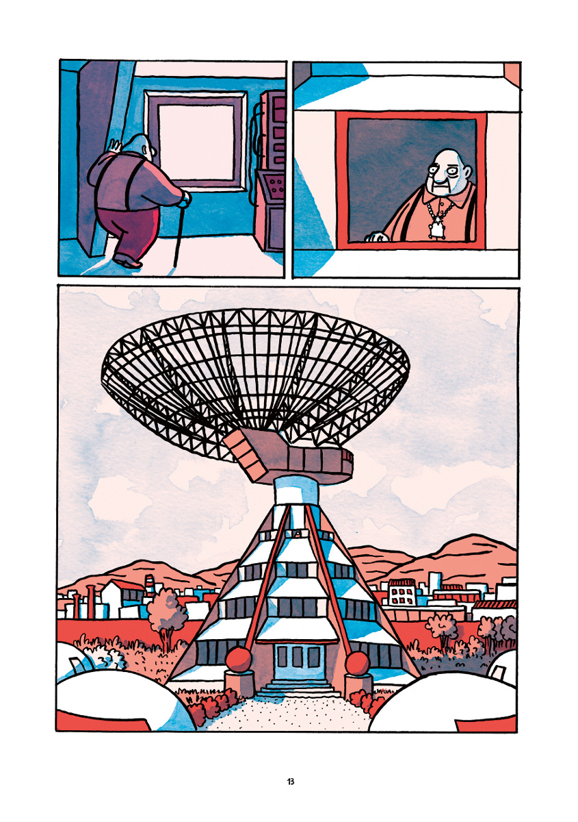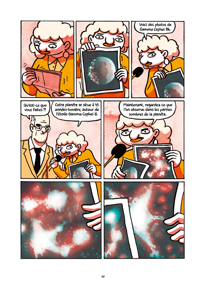 Le dessin de Robin Cousin est épuré : les visages et les paysages sont représentés avec un minimum de traits. On devine le goût de l’auteur pour les formes géométrique dans ses représentations de l’espace et de l’architecture. Le trait de Robin Cousin est sublimé pas une mise en couleur très réussie qui participe à la lisibilité de l’album. Le récit est intelligemment scandé par de belles doubles-pages parfois proches de l’abstraction qui représentent l’espace. Des milliards de miroirs est enfin bien servi par une fabrication impeccable à mettre au crédit des Éditions FLBLB.