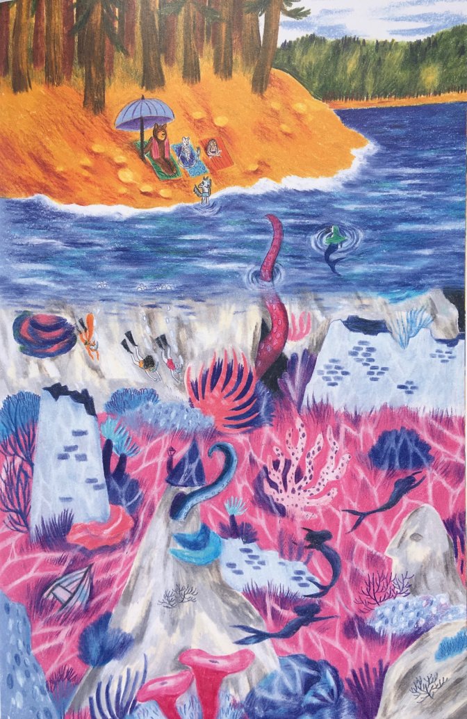 Les images réalisées aux crayons de couleurs happent ainsi le lecteur dans une contemplation active. Les nuances s’harmonisent autours de teintes roses et bleutées, pour dévoiler des paysages somptueux dont les nuances oscillent entre les toiles fauvistes et expressionnistes. Plus encore, la graisse des crayons permet de jouer sur les textures : l’image est travaillée en de nombreuses couches, elle est grattée, biffée et saturée, tandis que certaines plages de crayon pur se surimposent sur le dessin et que des motifs délicats apparaissent ponctuellement. Mathilde Poncet se livre ainsi à un véritable travail de recherche plastique, qui confère une grande richesse à ses images.