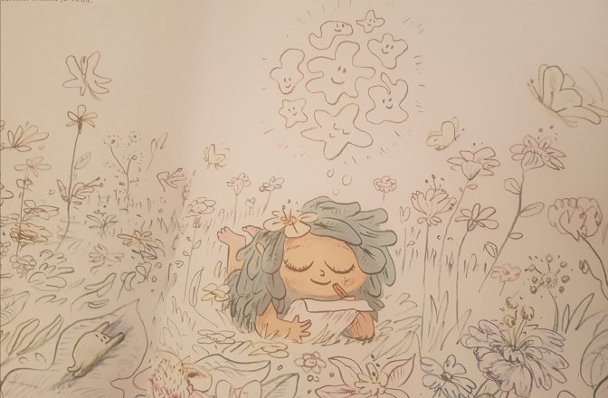 Notre héroïne a certes un visage humain rondelet et rose, mais son corps est une petite forme bleue, mi-plumes, mi-feuilles. N’est-elle pas Dieu elle même ?