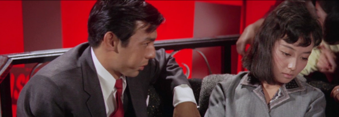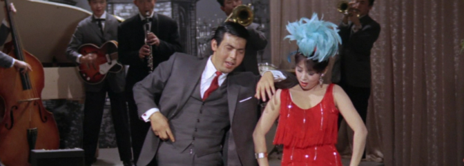 À ces éléments s’ajoute un héros, Tajima, sûr de lui, à la limite de l’arrogance, mufle et courageux, qui apparaît au volant d’une voiture de sport, peut pousser la chansonnette sur scène et met des lunettes de soleil la nuit. Mu par on ne sait quel sentiment de justice, il se jette dans l’aventure avec ardeur et s’infiltre de façon aussi invraisemblable que baroque (il est censé être un fils de prêtre, ce qui vaut une savoureuse séquence dans une église où tout est faux) dans un gang plutôt miteux. Pour achever le tableau, il est aidé par deux assistants constamment ridicules et inefficaces que leur accoutrement final achève de discréditer. Bref, Suzuki installe une distance constante avec un scénario qui pourrait être grave.