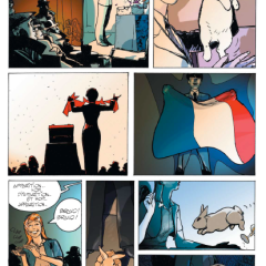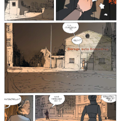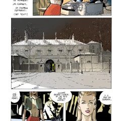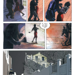 Les couleurs alternent entre la froideur de l’extérieur et la chaleur des intérieurs, entre cet espace immense où l’on ne peut se dissimuler et où il faut fuir sans cesse et ces lieux étroits où la foule s’entasse. Ces grandes nappes de couleur viennent se heurter, arrêter les aplats de noir, et la lumière perd soudain en réalisme ce qu’elle gagne en émotion. La composition joue également sur ces clair-obscurs, supprimant même une partie de la case pour ne garder parfois que deux silhouettes sombres se découpant sur fond blanc.