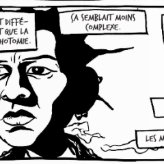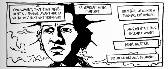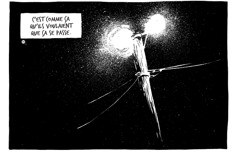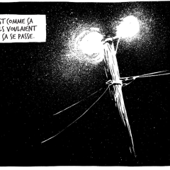 Le découpage est assez simple. Une à trois bandes de une à trois cases. Ces simples variations suffisent à donner de l’espace à la nuit, aux ombres, aux angoisses, ou bien à serrer sur les discussions, les échanges, les regards. Le découpage simple rejoint la simplicité du noir et blanc. Mais nous savons tous que faire simple n’est pas chose facile. Il y a du travail pour arriver à cette simplicité apparente.