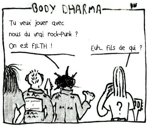 Dharma Punks nous rappelle jusqu’où des jeunes dépourvus de repères, avides de changement, peuvent aller. Une figure charismatique ou bien un homme inspirant la terreur au point qu’on ne lui refuse rien, même l’insensé, même l’attentat et voilà le groupe de rock punk Filth embarqué dans une attaque à la bombe !