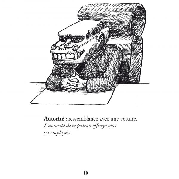 Le dicon nous offre une plongée absurde dans son univers à travers ses interprétations de la langue française. Les jeux de mots, le décalage humoristique de ses illustrations, le sous-texte politique sont autant de traits d’esprit qui pétrissent avec sonorité les petits détails de notre société et les travers de notre monde.