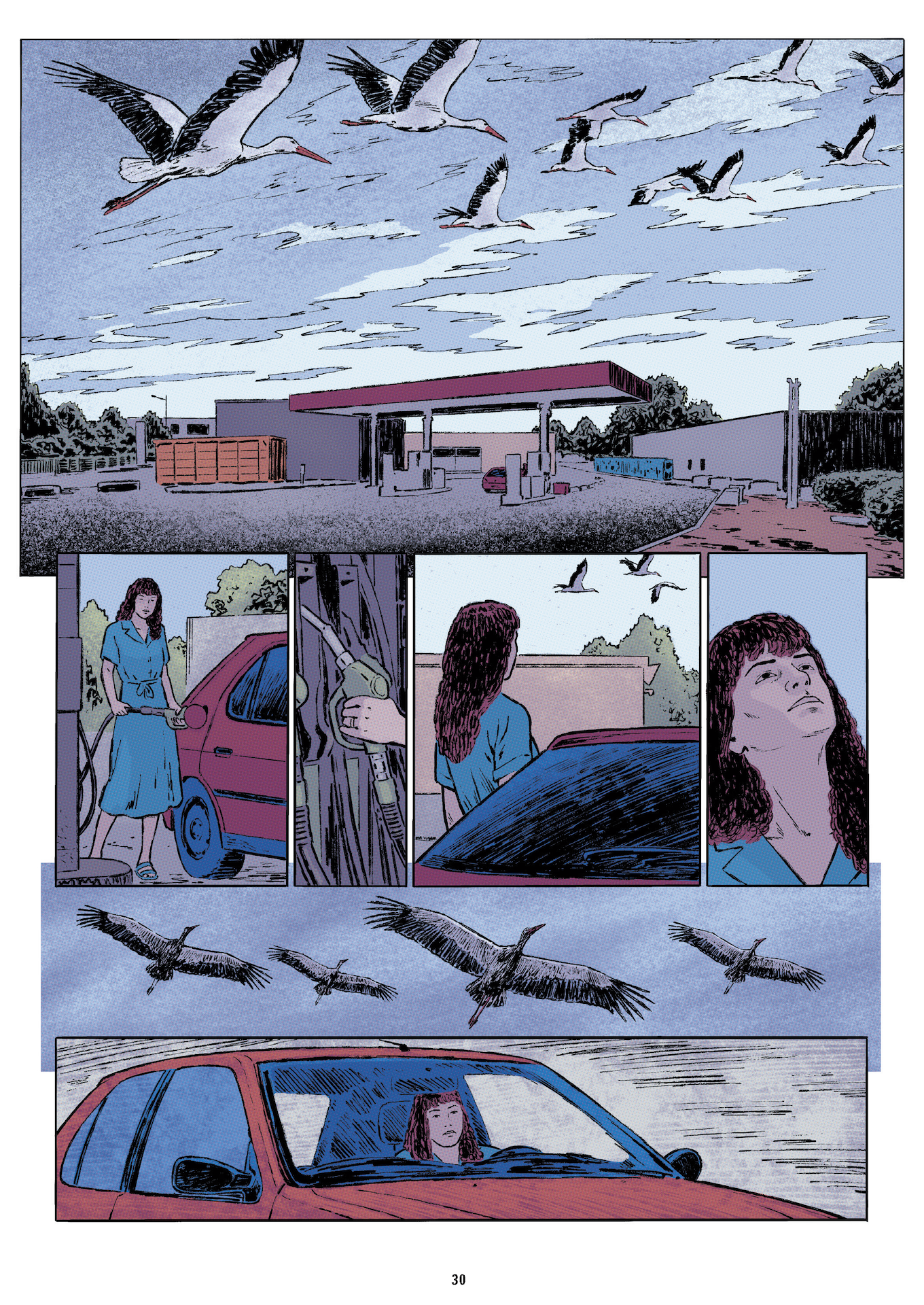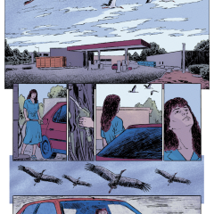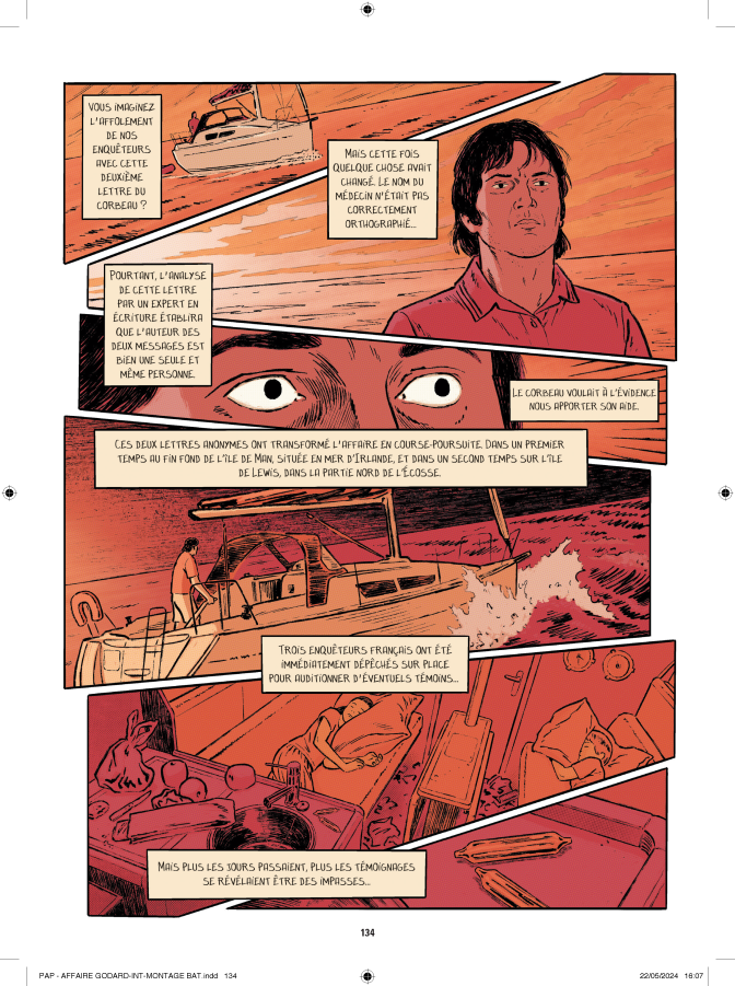 Le découpage des cases est plutôt classique, entrecoupé de pleines pages, récit blanc sur fond noir, remettant au clair les informations officielles. Le tout illustrant parfaitement le travail méticuleux et organisé voulu par les auteurs. Les pages sont colorée, à dominante de bleu, rappelant le contexte de la disparition et de l’enquête : l’océan.