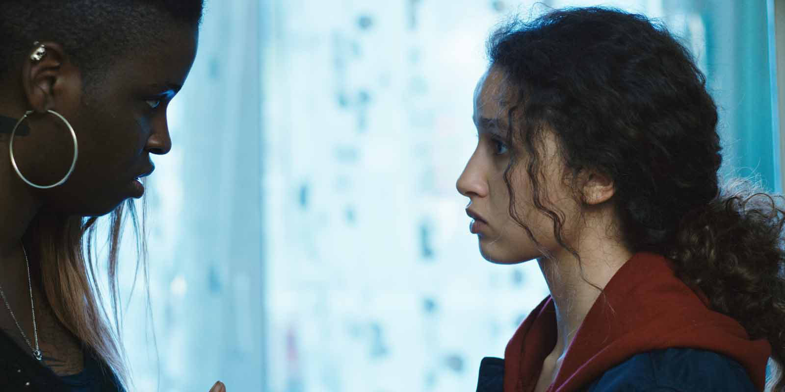 Sans que l’on y prenne garde, entre tragique et comique, on se retrouve embarqués dans l’univers de désolation de deux gamines au bagout et à la rage de vivre inaltérables, animées du désir commun de s’élever dans ce monde qui les rejette. Laurel et Hardy de banlieue (c’est ainsi que les présente la réalisatrice), Dounia la gringalette qui rêve de puissance et Maimouna la solide qui n’est que douceur forment un duo au ressort comique imparable basé sur leurs oppositions notoires. Dounia habite dans un camp de Roms avec sa mère. Elle ne connaît pas son père et dans la cité, on l’appelle « la bâtarde ». Elle est en quête de dignité. Elle refuse de croire aux discours de l’imam déconnectés de la réalité et bien plus encore aux jobs sans avenir qu’est censé lui offrir un BEP accueil (superbe scène où Oulaya Amamra révèle toute l’ampleur de son talent de comédienne). Elle veut être reconnue pour ce qu’elle est et n’a qu’un but : gagner beaucoup d’argent pour s’offrir voyages et voitures de luxe, habile alibi permettant à la réalisatrice de dénoncer sans s’appesantir les méfaits de l’ultralibéralisme. Mamounia a plus de chance que son amie Dounia. Elle vit dans un cadre familial strict, elle est la fille de l’imam. Le lien fusionnel qui va les porter tout au long du film est à la vie, à la mort, constitué d’un amour absolu et total comme seuls peuvent en concevoir des êtres purs et entiers. La gentillesse et la naïveté de Maimouna nous donneront l’occasion de nous régaler de quelques dialogues ciselés et hauts en couleurs.