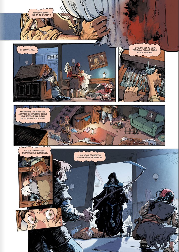 Résumé : L’album débute par un cambriolage nocturne, rapidement mis en déroute par Doña Laura et des membres de sa milice de justiciers. Mais dans l’action, un membre de la milice meurt. Est-ce l’infortune, l’épidémie de malchance qui a encore frappé ou bien juste le fait que les nouvelles recrues ne sont pas suffisamment entraînées ? Doña Laura est débordée et elle doit demander l’aide de Don Juan pour protéger la cité de Flots. Mais quel plan Don Juan a-t-il réellement en tête ?