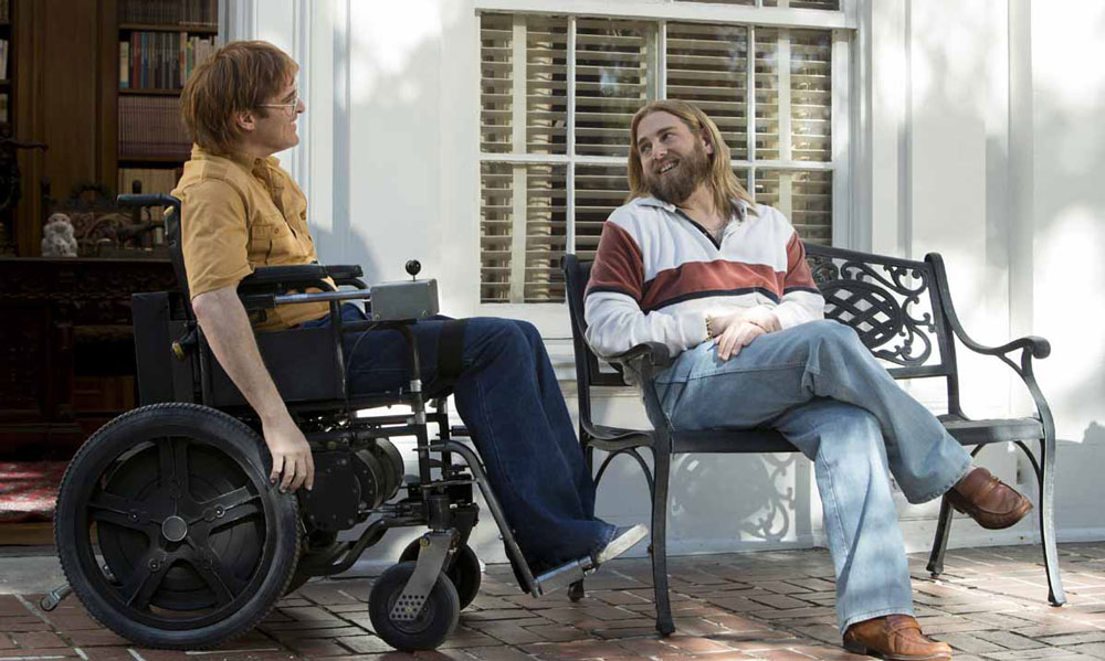 Ce qu’il est bon d’avoir en tête à propos de Gus Van Sant, c’est aussi qu’Harvey Milk est antérieur dans sa filmographie et que, depuis, ses réalisations ont subi un terrible déclin qualitatif, ne laissant qu’un lointain souvenir du succès que rencontraient systématiquement ses films plus audacieux lors de la précédente décennie. Son adaptation de l’autobiographie de John Callahan semble ne pas être vouée à briser cette malédiction. Même si Joaquin Phoenix (qui retrouve Van Sant vingt-trois ans après qu’il l’ait révélé dans Prête à tout) illumine cette histoire vraie de son charisme, le scénario souffre d’un développement trop peu soigné pour explorer comme il se doit toutes les facettes de cet homme au demeurant fascinant.