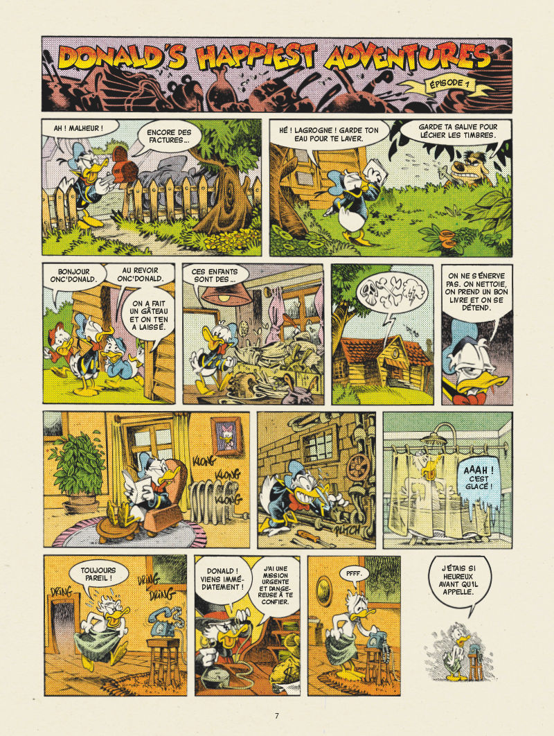 Donald’s Happiest Adventures fait toute la place à l’humour subtil de Trondheim. Les deux auteurs semblent prendre beaucoup de plaisir à revisiter à leur sauce l’univers de Disney. Ils exploitent en la détournant la nostalgie du lecteur pour offrir un récit énergique, drôle, et parfois profond.
