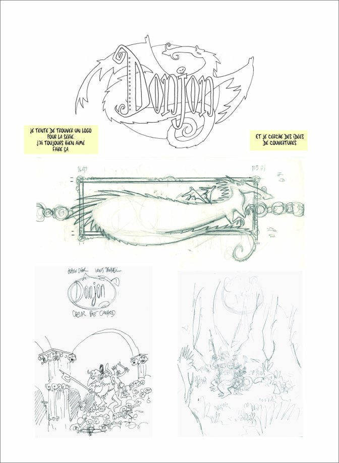 Critique La série Bonus porte bien son nom : sans narration, elle vient juste ajouter un album bien fourni pour développer ou expliquer l’univers de Donjon. Pour ce Creations et Parchemins, Sfar et Tronheim viennent raconter deux choses : tour d’abord, le premier album envisagé, avec ses planches originelles, tantôt storyboard en noir et blanc, tantôt crayonné coloré, qui met en scène les premiers Herbert, Marvin et Gardien, les tentatives de look, les ébauches de typo et de bannière. Ensuite, la genèse de l’œuvre, avec les échanges entre les deux auteurs, les hésitations, les reculs et les folies, comme cette lettre devant être adressée aux éditeurs parlant de Donjon comme un futur Astérix ! Effectivement, en terme d’albums, de densité, l’objectif fou a été accompli. Le détachement de Trondheim n’a d’égal que l’enthousiasme de Sfar, tout feu tout flamme dans ses écrits.