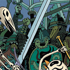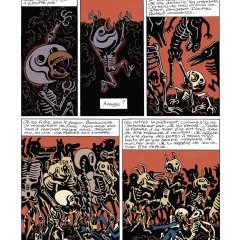 Le Donjon avait ses moments philosophiques, et certains épisodes, en particulier de Crépuscule ou même Potron-minet, apportaient leur lot de tension, de mélancolie voire de nostalgie. C’était peu le cas de la série dérivée Donjon Monsters, centrée sur les héros et monstres les plus emblématiques, notamment de la période Zénith. Mais celui-ci est peut-être le plus réussi, car il aborde un sujet pas évident, non seulement la mort mais aussi la réincarnation et le face-à-face avec l’éternité. Alors forcément, ce thème est noyé dans un combat sans fin, fait de crânes écrasés et de membres coupés, notamment par Alexandra au sommet de sa forme, mais les réflexions lancinantes du Gardien viennent mettre un coup au lecteur, qui sait par avance que ce ne sera qu’un one shot, et que la conclusion sur le devenir de ces squelettes, il pourra se la faire tout seul, avec ses larmes au coin de l’œil et la lèvre plissée… Sans aller jusque-là, il convient de saluer la tenue de ce treizième tome, là où certains pouvaient s’essouffler, le duo Sfar et Trondheim livre un album puissant dans ce qu’il fait ressentir, un souffle pas toujours facile à donner à une série de fantasy plutôt comique et donc légère.