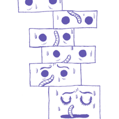 Le déroulement du récit est donc toujours imprévisible (à l’image de l’apparition de Titeuf, C3PO et de Lewis Trondheim !), les ruptures de rythme et de ton fréquentes, ce qui rend la narration toujours vive et ludique. Cela est enrichi par le jeu sur la disposition des cases dans la page et l’importance accordée aux espaces blancs, éléments qui accentuent l’aspect collage / montage du découpage et de la mise en page. Enfin, ces planches sont imprimées en violet et blanc, parti pris aussi singulier qui convient parfaitement à la dimension onirique de l’aventure.