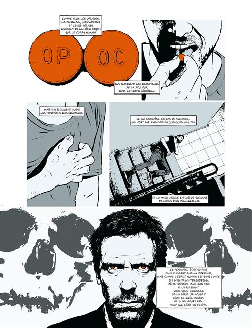 Pour ce qui est de l’atmosphère, le dessin lui accorde une touche de réalisme en noir et blanc assez glaçante. Références à la culture pop, personnages historiques, affiches ou évènements y sont retranscrits avec fidélité, avec quelques rares touches d’un ocre entre sang séché et pilule à ingérer. Les planches défilent avec cette impression d’évolution historique (on passe des fumeries chinoises aux ghettos américains de manière assez progressive) qui accompagne une déchéance (qui a cependant toujours existé) de l’humanité, piégée notamment dès ses premiers âges avec cette obsession de ne rien ressentir au combat (élément d’autant plus terrifiant que les Nazis l’ont adopté et donné en exemple à tout le monde moderne) et jusqu’à nos jours avec les industries pharmaceutiques en quête de milliards... Le noir et blanc sublime donc cette atroce dérive, à la manière d’un polar plutôt que d’un essai.