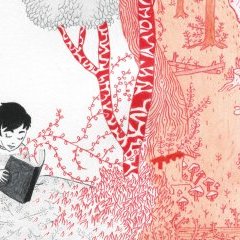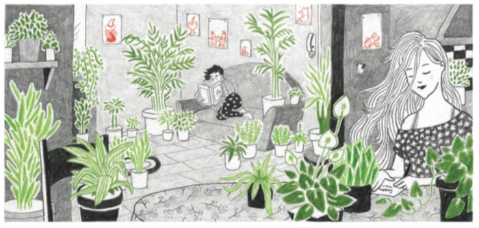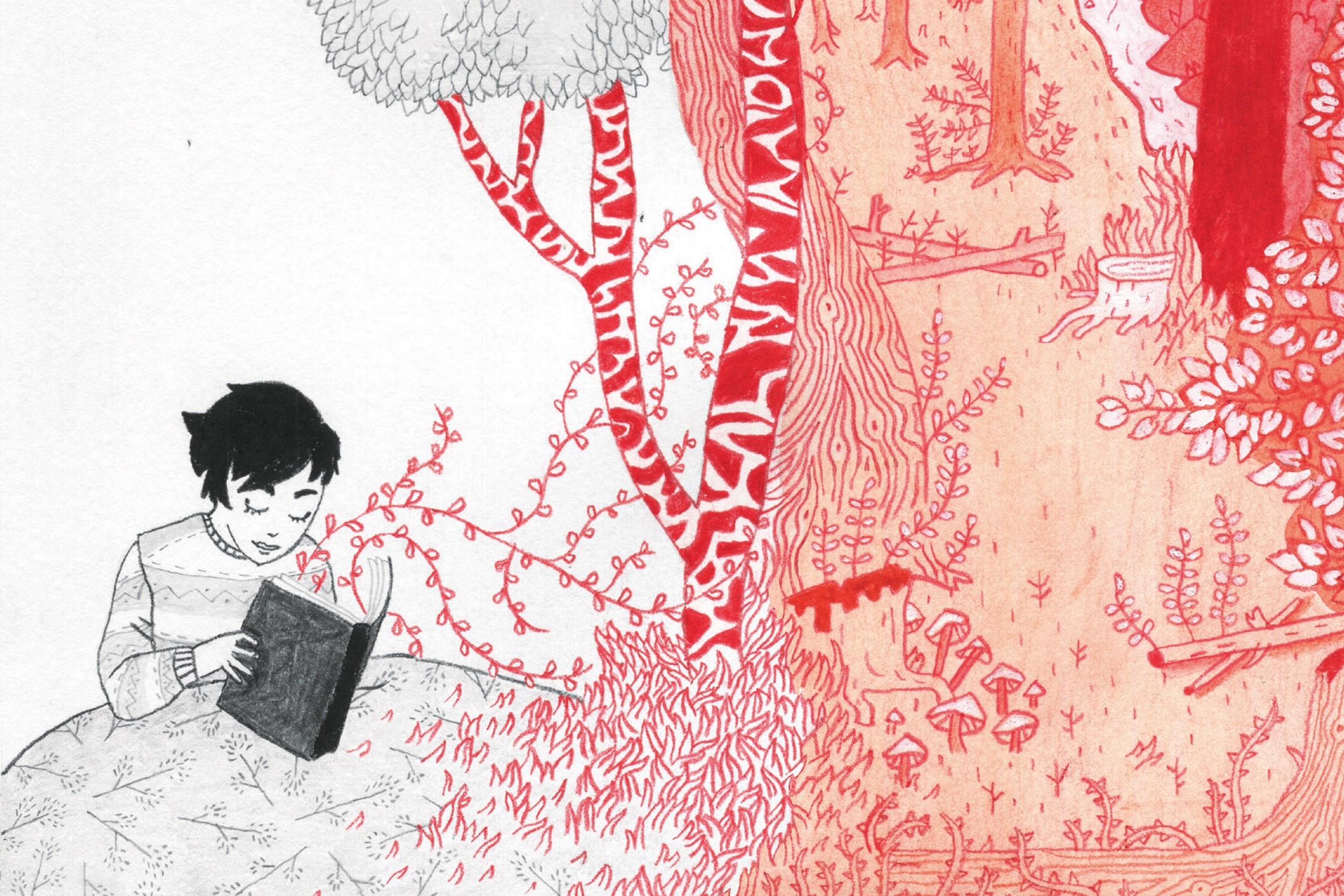 Dépitée, triste et seule, Yacha ouvre un livre duquel s’échappe toute la magie de ce dernier : des arbres foisonnants qui envahissent ses intérieurs.