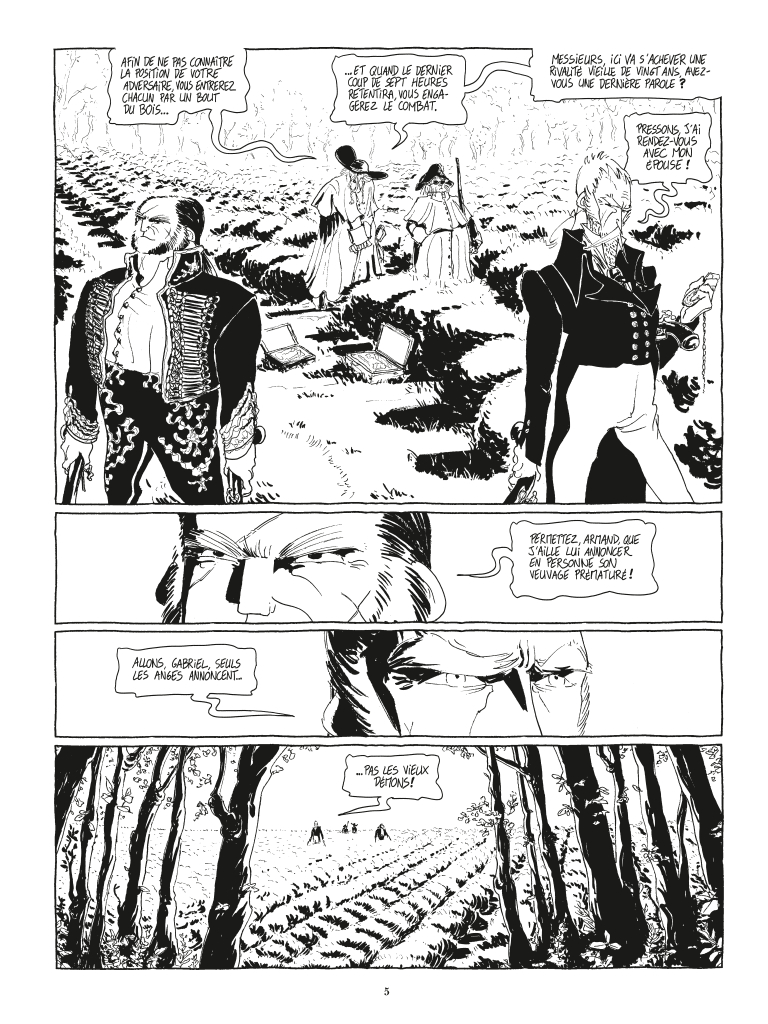 Si le scénario était déjà pré-écrit par un auteur chevronné du XIXème, il fallait en revanche s’occuper du dessin, où tout était à faire. Le moins que l’on puisse dire, c’est que la patte de Renaud Farace se fait sentir, et ce dès les premières pages. Le noir sur le blanc, quelques pages rouges qui rappellent la couverture et le thème de ce livre, des petits traits précis et fins, un style qui accroche autant, voire davantage, que l’intrigue. Rappelant le style d’un Sempé, le trait détache complètement les deux personnages, mais donne des pages étrangement différentes. L’ensemble qui se dégage est incroyablement sensible et vif, comme les passes d’armes des deux protagonistes.