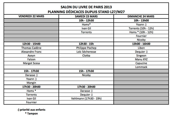 Du 22 au 25 mars, retrouvez les Éditions Dupuis Porte de Versailles sur le stand L27 / M27 lors du 33ème Salon du Livre de Paris. De nombreux auteurs invités sont annoncés par l’éditeur. On pourra apercevoir Aseyn, Thomas Cadène, Capucine, Clotka, Darasse, Dequier, Joseph Falzon, Fournier, Alexandre Franc, Ivan Gil, Joub, Homs, Libon, Lommsek, Mangin, Manu XYZ, Margot Scesa, Nicoby, Pochep, Frédéric Richaud, Sylvain Runberg, Sécheresse, Singeon, Torrents, Vehlmann et Yoann. Beaucoup de beau monde en perspective.