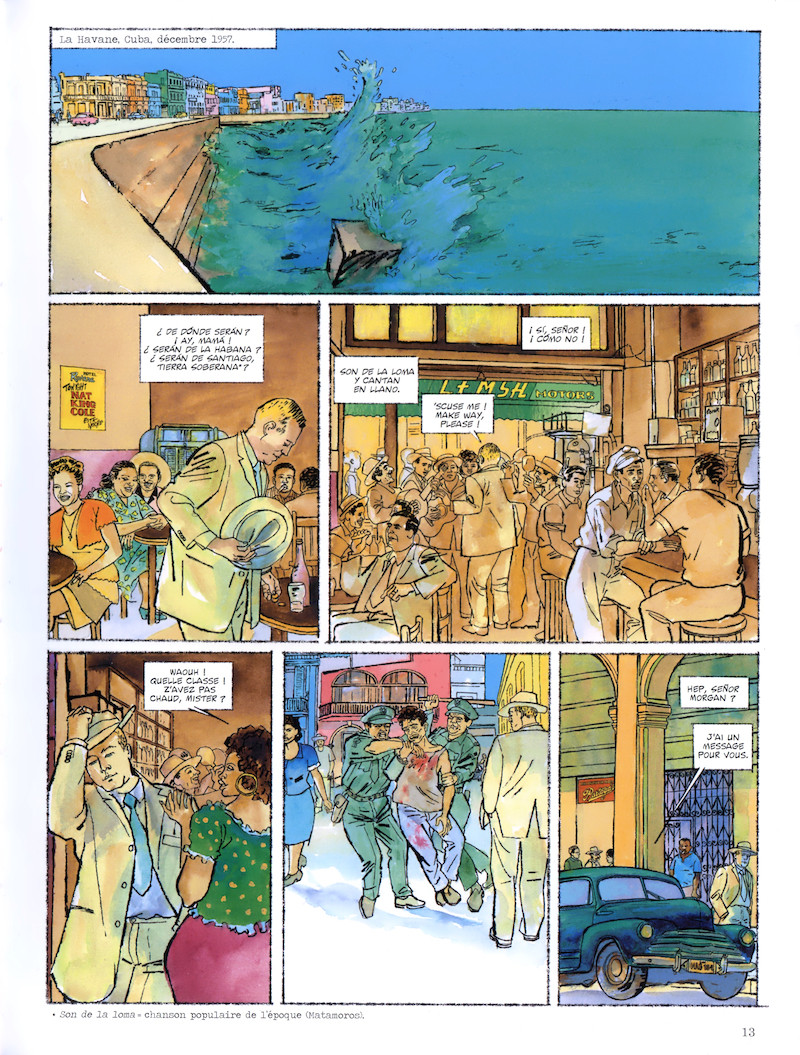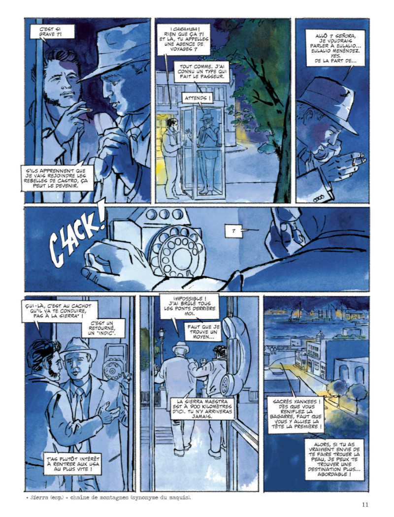 Ce dessin à l’aquarelle, tout de vert et de bleu pour évoquer l’île et sa jungle, procure un très bon rendu, mais, réalisme forçant, il y a une certaine lassitude à voir défiler les pages qui se ressemblent, notamment des scènes de nuit ou dans le quartier général. Au-delà de cet écueil qui est un gage de vérité, il n’y a pas grand chose à redire, tant l’atmosphère moite se diffuse, des escarmouches banales et pleines de poudre dans les montagnes jusqu’aux relents âcres de la prise de contrôle de La Havane. Il s’agit d’un vrai document historique, mais avec un fond flou et vert pour l’encadrer qui se dessine page à page.