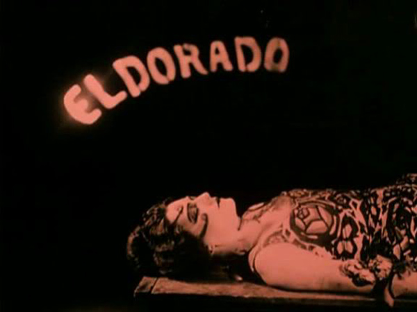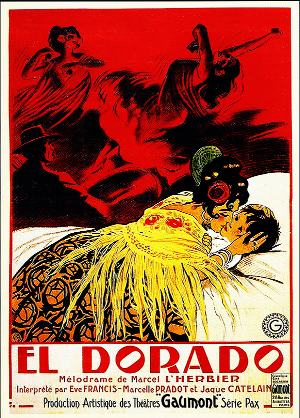 Dès la scène d’ouverture, nous sommes plongés dans l’ambiance : un cabaret, des danseuses, l’ivresse de l’alcool, la sensualité de la danse, la claquement des castagnettes, les couleurs chatoyantes, la fumée, les costumes extrêmement bien choisis, particulièrement la robe et la coiffure de Sibilla qui donnent réellement corps au personnage interprété par Eve Francis. L’Herbier fait preuve de modernité dans le découpage des scènes (les plans s’enchaînent, s’entrecroisent, les angles de prise de vues diffèrent dans une même scène) mais également dans les mouvements de caméra (panoramique, travelling arrière), incroyablement fluides pour l’époque. L’art de Marcel L’Herbier est de réussir à nous faire aussi bien ressentir l’ambiance sonore à travers le montage et la teinte des images, aidés bien sûr par la bande musicale spécialement composée par Marius-François Gaillard, à partir du montage définitif. La musique tient d’ailleurs une place très importante dans le cinéma de L’Herbier. Il pense que les images seules ne suffisent pas à faire passer l’émotion, elles doivent être sublimées par la musique. C’est pourquoi El Dorado est un « mélodrame », selon son propre terme.
