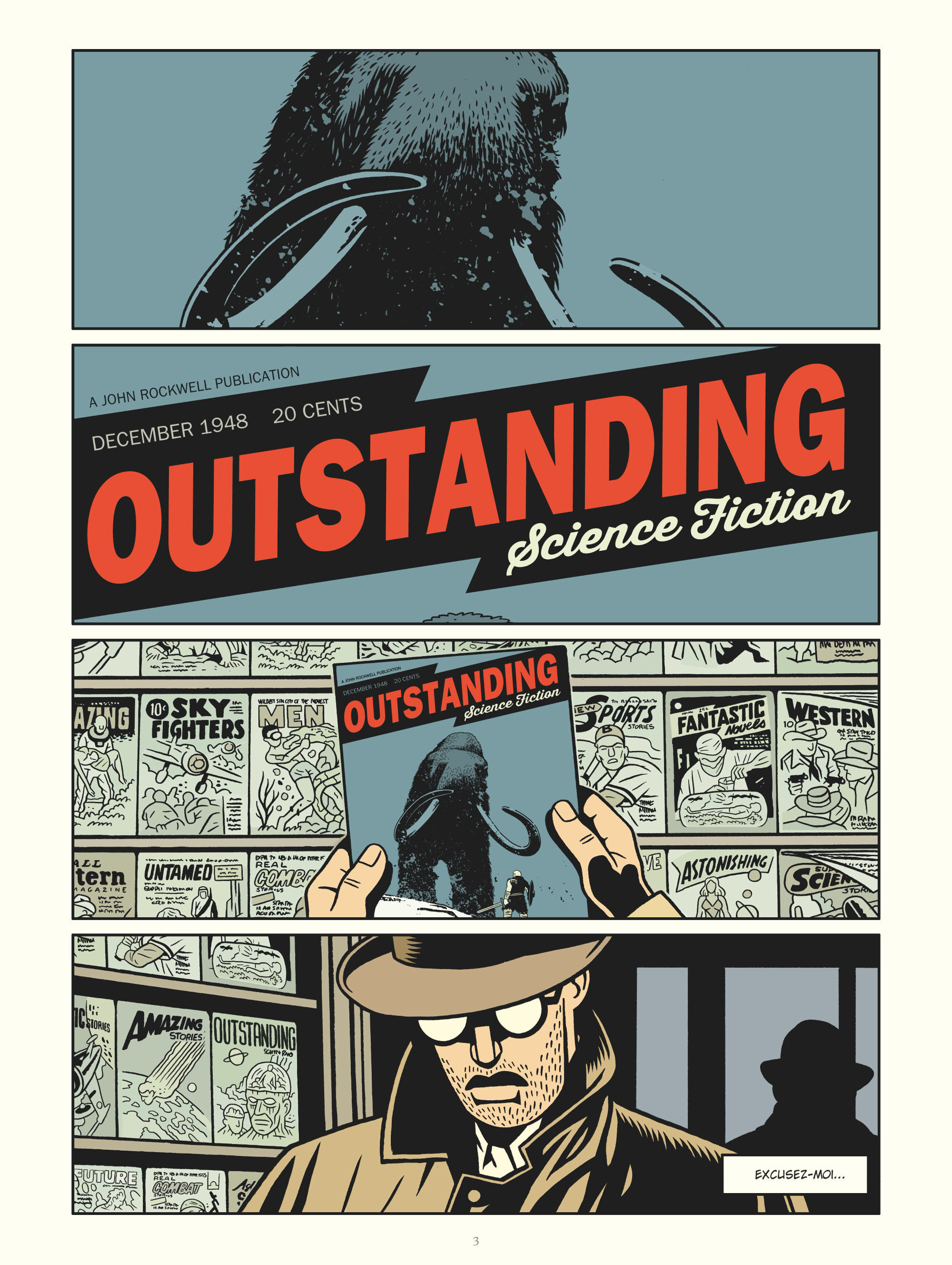 En 80 pages, Electric Miles pose de façon efficace ses personnages et l’atmosphère fantastique du récit – la scène avec le chien des Millman, qui justifie le choix de la couverture, est à cet égard remarquable – et ménage son suspens, avec son cliffhanger digne des meilleures séries Netflix. Le dessin de Brüno, qui se fonde sur un trait épais et des aplats de couleurs, nous ramène dans le Los Angeles de l’après-guerre. Le dessinateur insère quelques scènes qui nous font basculer dans l’étrange, et qui rendent un vif hommage à cette culture pulp dont les auteurs se sont nourris pour construire leur récit. Les fausses couvertures d’Outstanding qui présentent les récits d’Arbogast de l’entre-deux-guerres prolongent le plaisir visuel et renforcent l’étrange impression d’être à la lisière entre la réalité et la fiction.