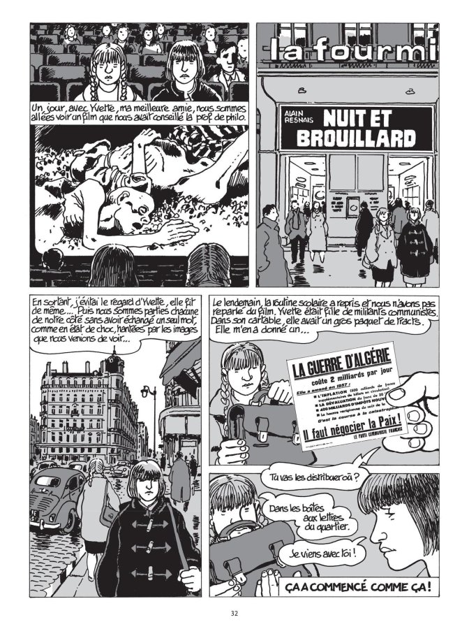 Tout a déjà été dit sur le style de Tardi, qui est aussi essentiel pour l’art de la bande dessinée qu’il est intemporel pour l’art de la dénonciation, du pamphlet et de la critique, faisant de lui un héritier des Lumières, Hugo et autres esprits français. Ici, il reprend son pinceau pour dévoiler une époque moins lointaine que celles qu’il a déjà peintes, où l’on reconnaît bien le manteau noir, sombre, des brigadiers, les yeux d’un trait tiré plein d’abnégation, mais il reste de belles nouveautés. L’irruption de tracts est soignée, les bidonvilles sont montrés, c’est tout de même la haine qui transparaît, insidieuse, mauvaise, prête à revenir à chaque époque.