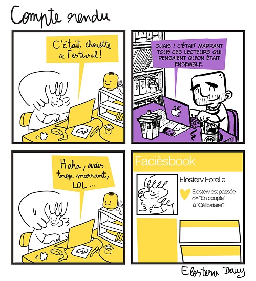 C’est en marge du Festiblog que nous avons rencontré la pétillante Elosterv et le tout aussi pétillant Davy Mourier. Dans le cadre champêtre du square du temple, en face de la mairie du IIIe, nous avons parlé de leur blog BD, Relation Cheap, écrit à 4 mains, qui raconte avec un humour décalé leur relation à distance.