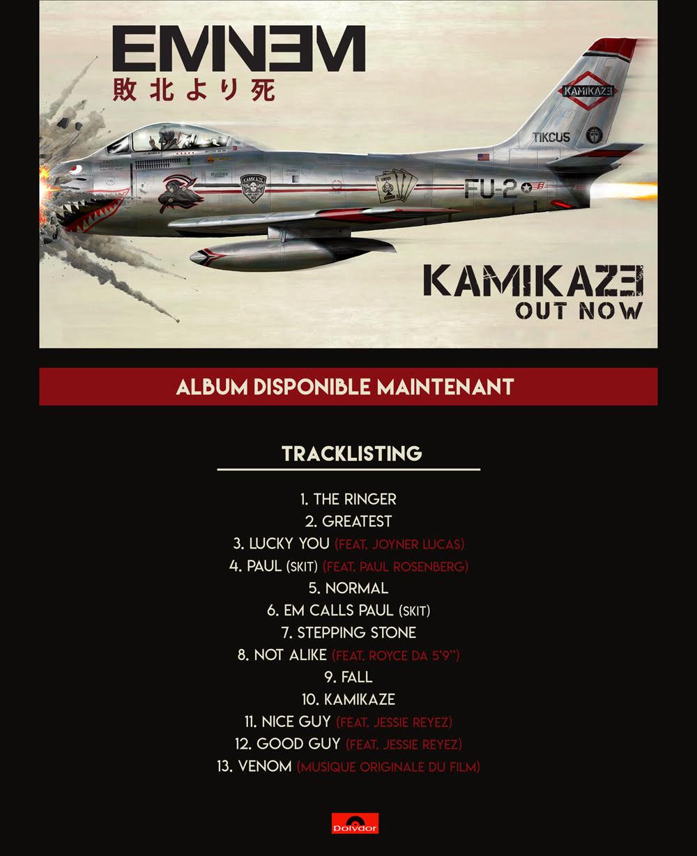 Ce féru de travail a visiblement dans la gorge le succès de Drake qu’il interpelle, car le shady n’est pas mort, dans le hargneux Fall. Avec le bien-nommé Kamikaze, il fonce dans le gras de ses adversaires pour leur exploser l’ego et gonfler le sien, et montrer que le roi du flow, c’est lui, que sa carcasse blanche était là avant tous les hit-makers du moment et qu’il ne compte pas chuter et céder son trône alors que se dessine une scène plus tolérante qu’il méprise via l’attaque chargée contre Tyler the Creator).