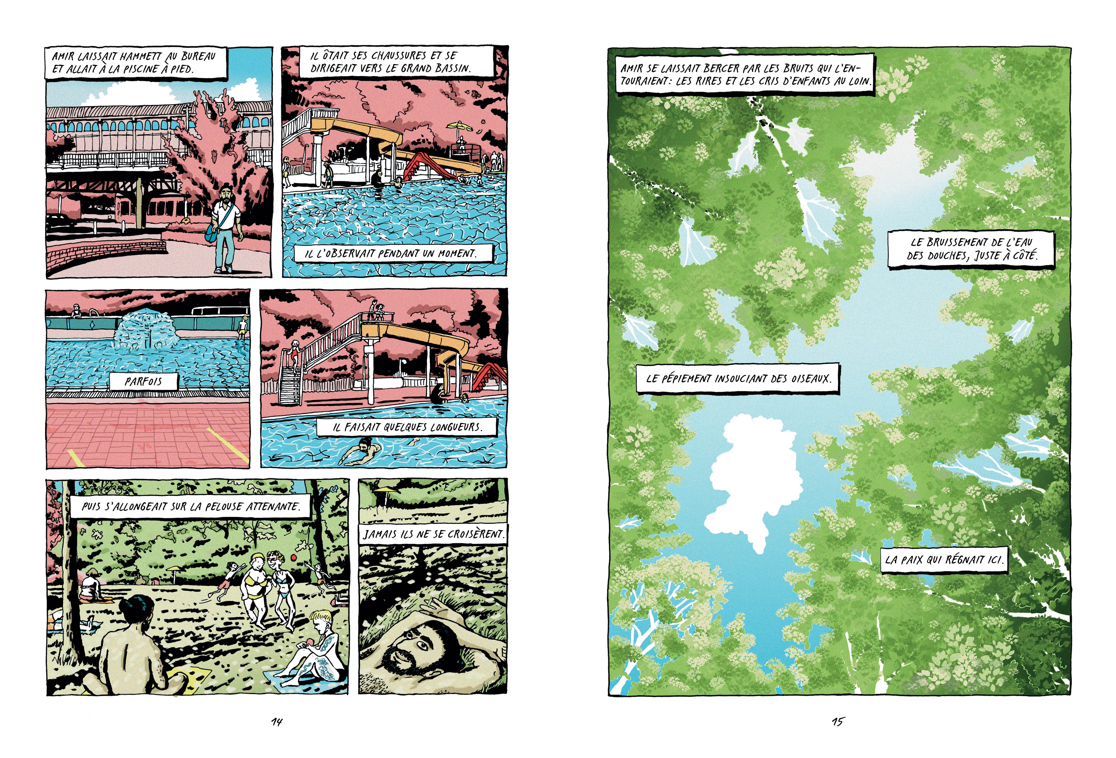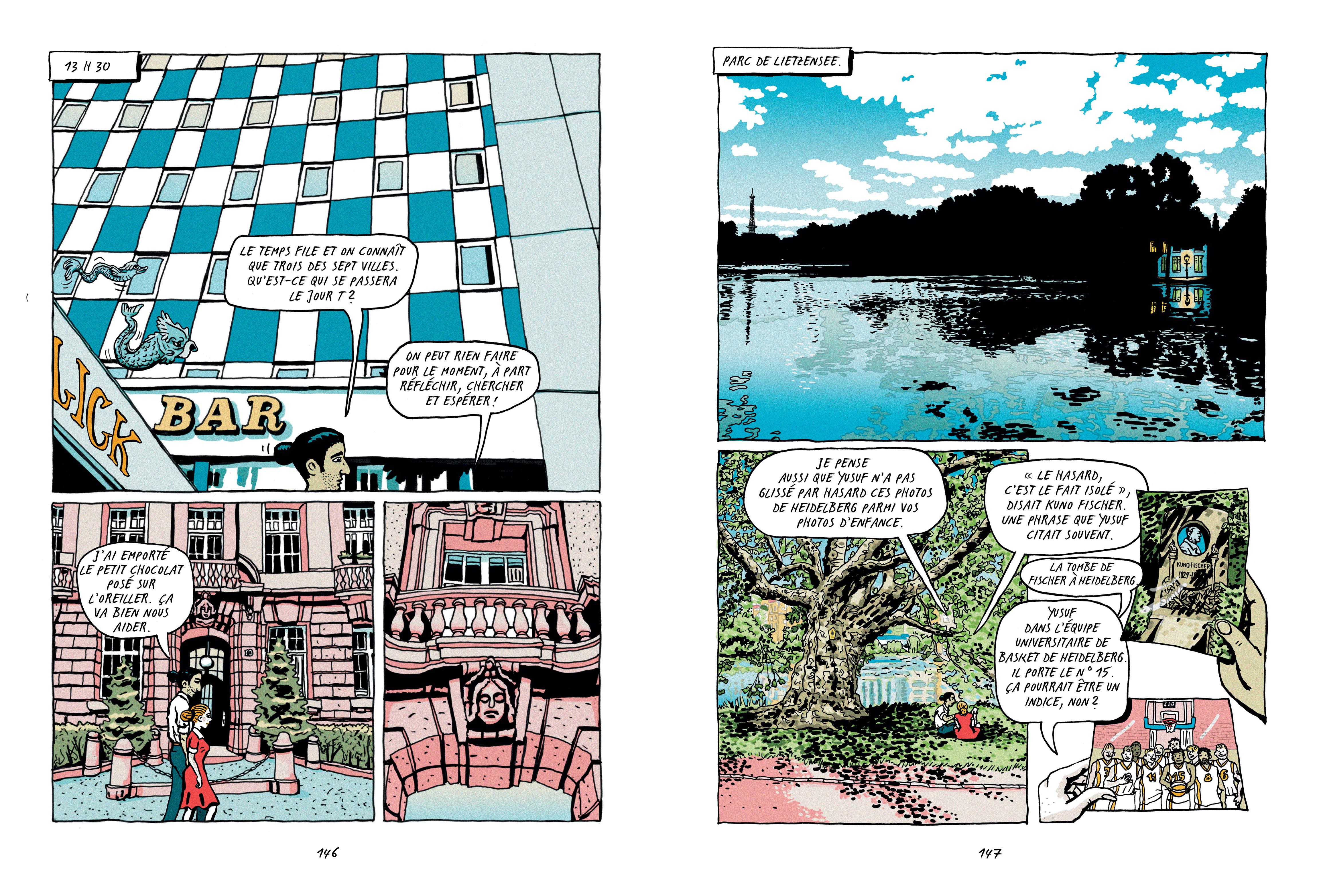 Les premières pages du récit présentent les deux personnages éponymes, qui fréquentent les mêmes lieux – différentes piscines de Berlin – sans se connaître, jusqu’au jour de l’attentat. Emma et Amir ont des caractères bien différents, voire opposés : lui vit seul avec son chien – mort quelques jours avant l’attentat qui fait basculer sa vie –, elle est une aventurière qui ne tient pas en place. Lui vit cet événement comme une tragédie intime, avec la perte d’un être cher. Elle persiste dans sa volonté d’avancer et de découvrir la vérité derrière le drame. Leur quête commune menée entre les deux capitales scelle leur union, qui se joue des stéréotypes ethniques et de genre, comme un pied de nez à l’actualité anxiogène du récit – lorsqu’ils séjournent à Paris, ils apprennent que d’autres attentats frappent les grandes villes européennes – qui fait bien entendu écho à la nôtre.