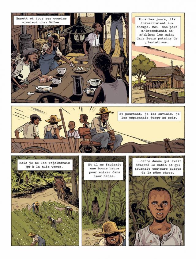 Forcément poignant, par sa violence d’abord atténuée puis évidente, même si elle reste métaphorique, le dessin ne veut pas se forcer. On se prend à vouloir passer les passages situés dans le présent, qui montrent les narrateurs d’aujourd’hui parler d’hier, ce passé qui est le plus intéressant, aussi bien dans le scénario que dans le graphisme. Ce Sud étouffant, ces routes et ces champs pleins de poussière, ces marais qui sentent mauvais, tout cela n’a aucun charme mais justement, c’est là toute l’efficacité du dessin, qui a rempli donc son office : créer une atmosphère. En cela, les passages situés hors de cette époque sont un peu en décalage, moins prenants.