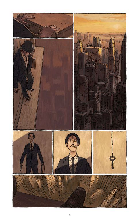 Les planches mettent en valeur ces fantômes par un dessin écorché, et pourtant précis dans les plans, comme l’attestent les pages de calques dissimulées à l’intérieur pour expliquer le travail de dessinateur. Ce travail consiste ici à faire une montée dans les étages en forme de descente dans la folie, à crayonner les visages pour les faire grimacer, à faire couler les murs au lieu de leur donner dr la dureté. Avec ce trait, c’est un ensemble qui vacille, qui tombe alors que s’élèvent les nuages autour, et la tour pourtant solide paraît devoir s’effondrer à de multiples reprises. Mais à l’instar de son propriétaire, elle reste debout, les autres ne devant que s’incliner. Cette inclinaison, le dessin la fait transparaître, dans un vrai tour de maître.
