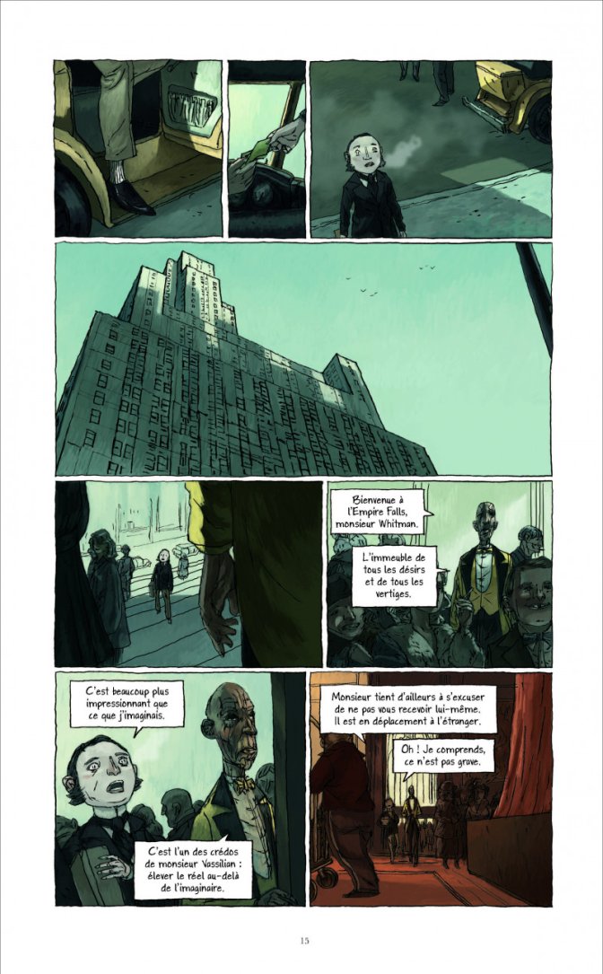 Empire Falls Building pourrait être ce croisement entre une histoire de Schuiten et Peeters, faisant la part belle à l’architecture jusqu’à cette démesure fantastique, et Le Chef d’œuvre inconnu de Balzac, pour son atmosphère de génie vain et de travail inachevé. Le sous-titre « Anatomie d’un vertige » entraîne d’ailleurs irrémédiablement le lecteur vers la pente du doute, de la folie, du néant. Après l’ ambition et l’orgueil, comme dans tout bon roman fantastique, la chute est d’autant plus effroyable qu’elle est anticipée et c’est là toute la saveur de cette œuvre. S’il serait impossible de s’étonner d’une fin tragique, il est justifier de chercher à percer un maigre espoir, d’autant que le lecteur mène une quête en parallèle de celle du héros pour croire à un message, à une idée là où l’absurdité et le chaos règnent. En cela, les personnages apportent chacun à leur façon des éléments intrigants – en particulier les concierges ou commis voyageur, plus que le trio des protagonistes principaux –, pour que les salles de ce Building soient traversées par encore plus de fantômes.