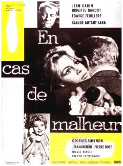 Critique : Même François Truffaut aimait En cas de malheur ! Lui qui, intransigeant critique aux Cahiers, n’en finissait pas, comme tant d’autres, de vilipender un certain cinéma qualifié au mieux « de qualité », au pire « de papa ». Cette adaptation de Simenon a été voulue par les producteurs pour mettre en avant deux des monstres sacrés du cinéma de l’époque : Jean Gabin et Brigitte Bardot. Le premier était au sommet artistique et commercial de sa carrière, terminant une décennie glorieuse qui l’avait remis au plus haut après le succès critique et public de Touchez pas au grisbi (1954) de Jacques Becker. La seconde, estampillée sex-symbol, devenait un phénomène de société incroyable depuis le triomphe d’Et Dieu créa… la femme (1956) de son mentor Roger Vadim. Confrontation de deux stars, mais aussi de générations et de styles de jeu différents. Autant-Lara s’est entouré de plusieurs collaborateurs fidèles, dont les scénaristes Aurenche et Bost (le second seulement pour les dialogues), et des « professionnels de la profession » chevronnés, tels le décorateur Max Douy et le compositeur René Cloërec. On peut dire que le film présente ici un véritable travail d’équipe, Autant-Lara coordonnant avec bonheur tous ces talents. Le récit, fidèle à l’univers de Simenon, est habile à décrire le désenchantement d’un avocat vieillissant, pris au piège du grand amour pour une jeune délinquante, quitte à sacrifier sa vie de couple (éblouissante Edwige Feuillère en épouse blessée mais lucide) et son statut professionnel. La narration se concentre aussi sur le mal-être d’une certaine jeunesse, dont la soif de liberté était quelque peu étouffée dans une France gaulliste étriquée pas encore ébranlée par les contestations soixante-huitardes. Autant-Lara et ses scénaristes ont choisi leur camp, celui des personnages avides de s’affirmer. On retrouve alors la critique féroce de l’hypocrisie bourgeoise, comme dans les autres grandes œuvres du cinéaste, de Douce à La traversée de Paris en passant par Le diable au corps et Le blé en herbe. Pour autant, la mise en scène n’est pas négligée et Autant-Lara compose des plans mémorables, comme celui d’un bouquet de fleurs livré par erreur et jeté du haut d’un escalier, ou cet « effet Koulechov » quand la caméra scrute le visage de Gabin au dénouement. Il va sans dire que les deux acteurs principaux sont formidables, et Brigitte Bardot réussit avec brio son passage à des rôles dramatiques, annonçant sa future composition dans La vérité (1960) de Clouzot. De brillants seconds rôles les entourent, de Madeleine Barbulée en secrétaire fidèle à Julien Bertheau en commissaire de police, en passant par Nicole Berger en demoiselle de compagnie faussement ingénue. Le film, Lion d’argent au Festival de Venise, fut un gros succès public. On peut dire aussi que c’est la dernière réussite d’Autant-Lara, à l’exception peut-être du méconnu Tu ne tueras point (1961). Les longs métrages qui suivront seront indignes de son talent et ne feront qu’apporter de l’eau au moulin à ses détracteurs.