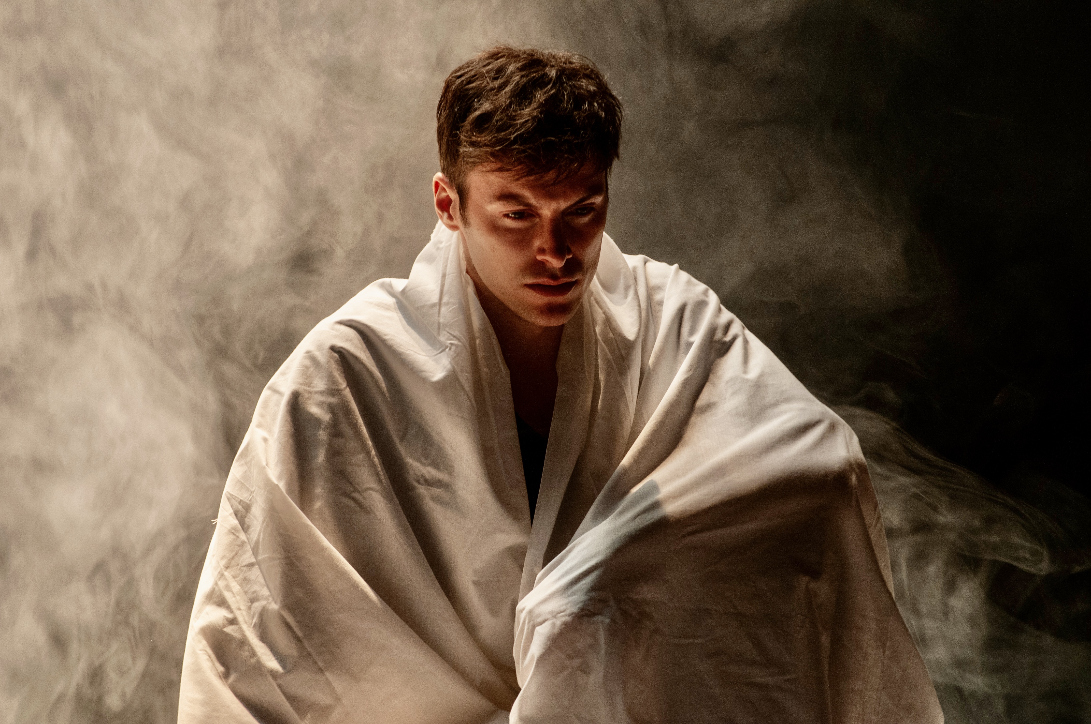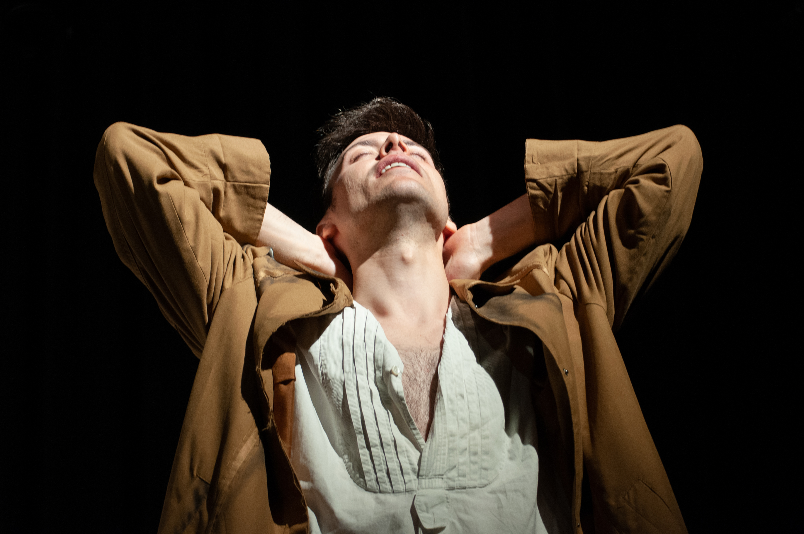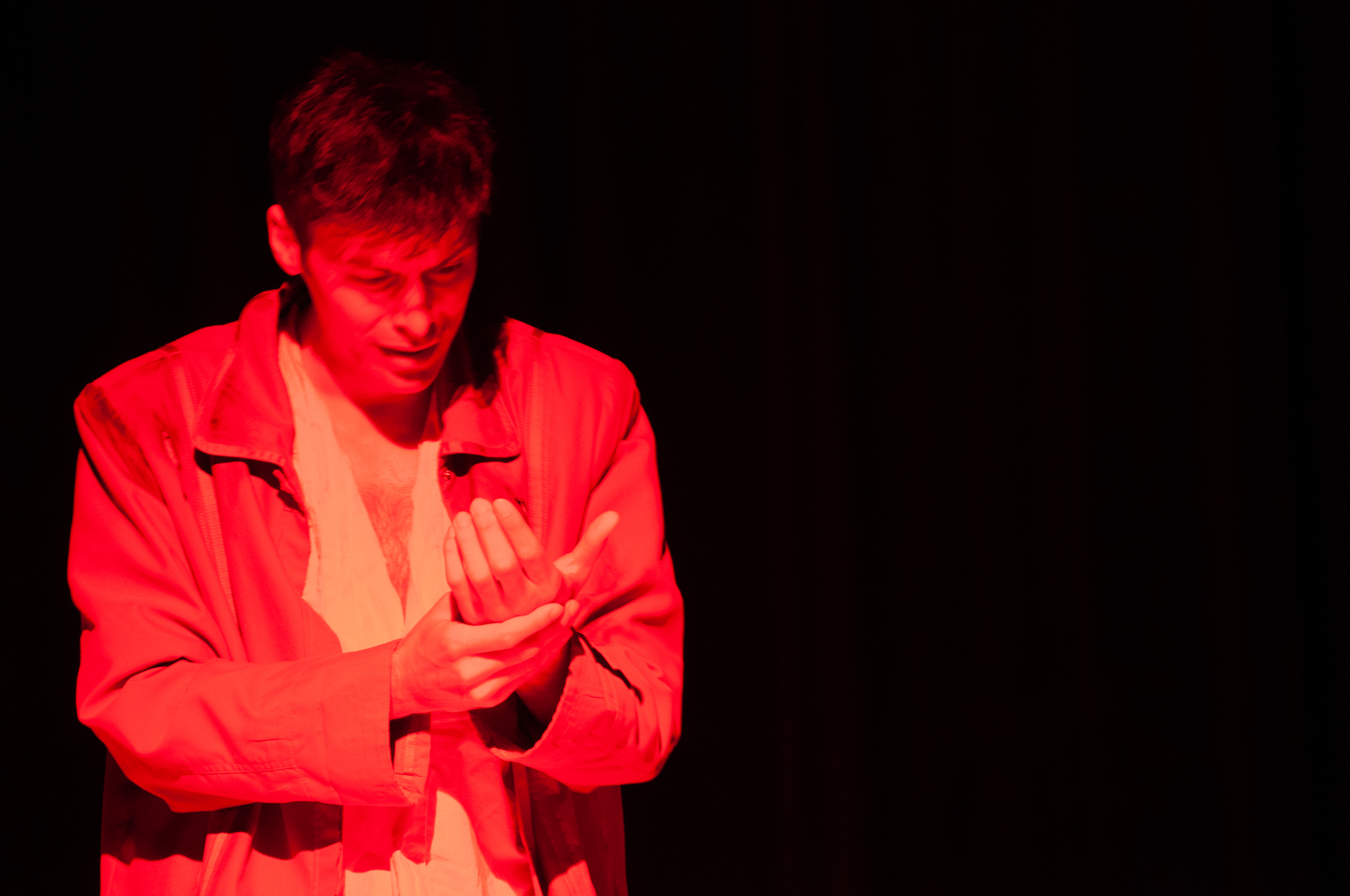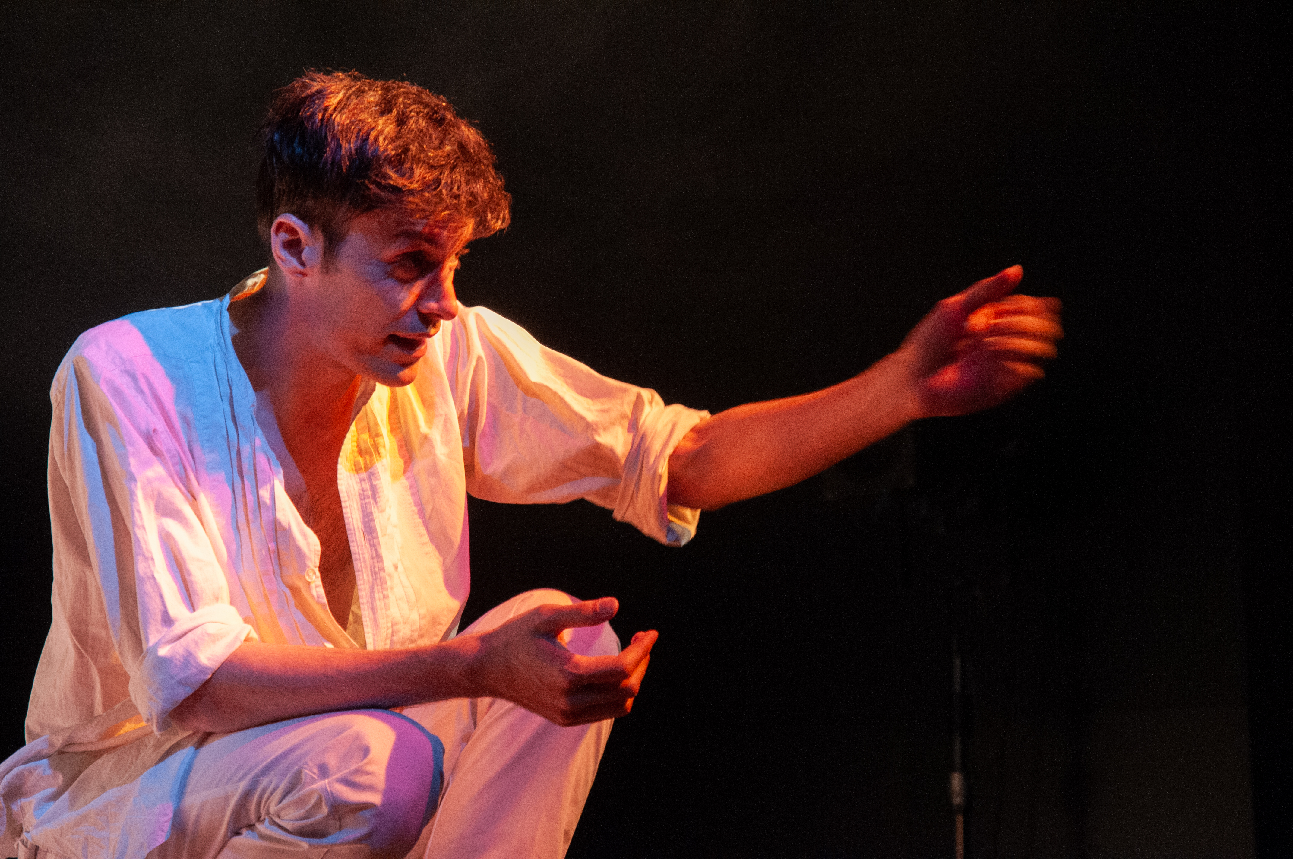 En tête-à-tête avec Rimbaud, en plus d’une écriture conçue par le comédien lui-même et sa metteuse en scène, c’est d’abord la prestation formidable de Mickaël Winum. Le comédien occupe tous les pans de la scène avec ses gestes et sa voix étoffés. Il crie dans un langage soigné les conflits du poète avec sa mère, la relation pétrie de violence et d’affection avec son aîné de dix ans, Paul Verlaine, et les années de fuite en Abissyrie ou ailleurs. L’acteur ne ménage pas les efforts, les émotions pour porter ce personnage de roman, autant qu’il a été poète, révolutionnant l’écriture de la fin du XIXe siècle.